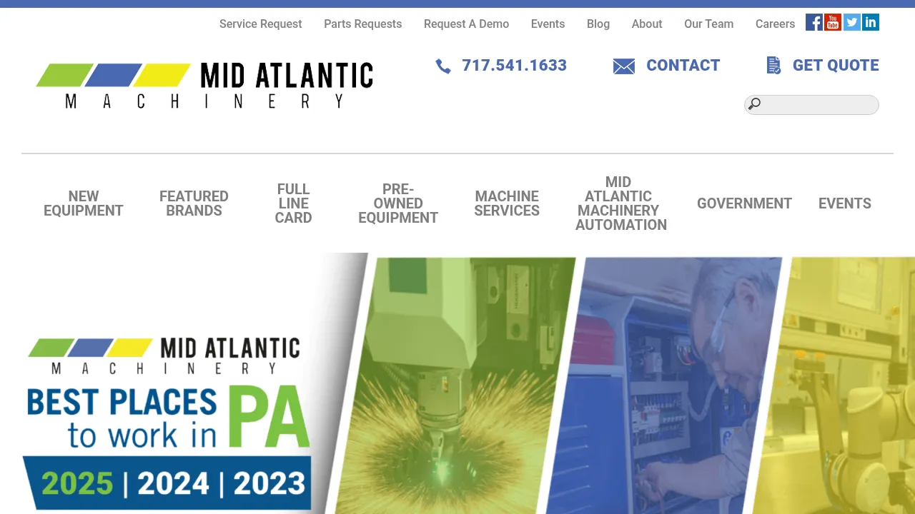 Mid Atlantic Machinery is a distributor of metal fabrication and industrial manufacturing equipment serving the Mid Atlantic and New England regions. The company provides a comprehensive range of machinery, including laser cutters, press brakes, robotic welding systems, and saws, alongside specialized installation and repair services. Catering to sectors ranging from small job shops to government contractors, they focus on helping clients improve production efficiency and reduce processing costs. Their business model integrates technical sales, application engineering, and ongoing maintenance support. They also offer a selection of certified pre-owned equipment to help businesses expand their capabilities.