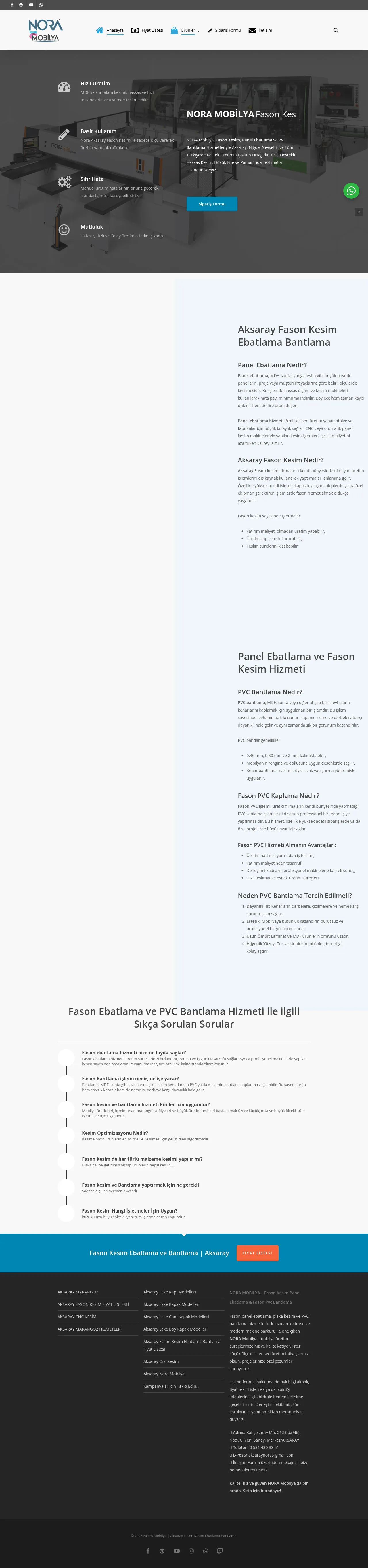 NORA Mobilya is a professional manufacturing service provider based in Aksaray, Turkey, specializing in contract panel processing. The company serves a diverse range of clients including furniture manufacturers, interior designers, and carpentry workshops with precision CNC-guided cutting and edge banding. By providing outsourced production solutions, NORA Mobilya helps businesses increase production capacity, reduce labor costs, and minimize material waste without the need for significant capital investment. Their operations leverage professional-grade machinery to ensure high-quality standards and timely project delivery. They offer scalable support for both small-scale projects and high-volume industrial series production.