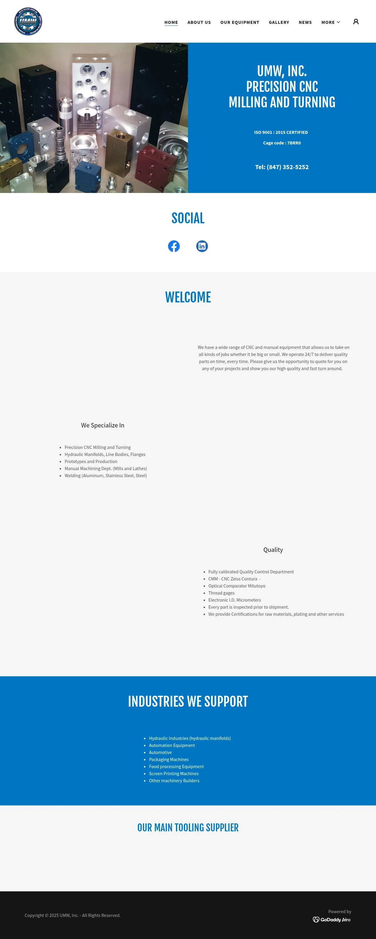 UMW, Inc. provides precision CNC milling and turning services, specializing in the production of hydraulic manifolds, line bodies, and flanges. The company serves a diverse range of industries including automotive, automation, packaging, and food processing machinery. They maintain a fully equipped facility with both CNC and manual machining capabilities, supported by an internal quality control department. Every component is rigorously inspected prior to shipment, and all inspection equipment is strictly calibrated. The company manages both prototype development and high-volume production runs.