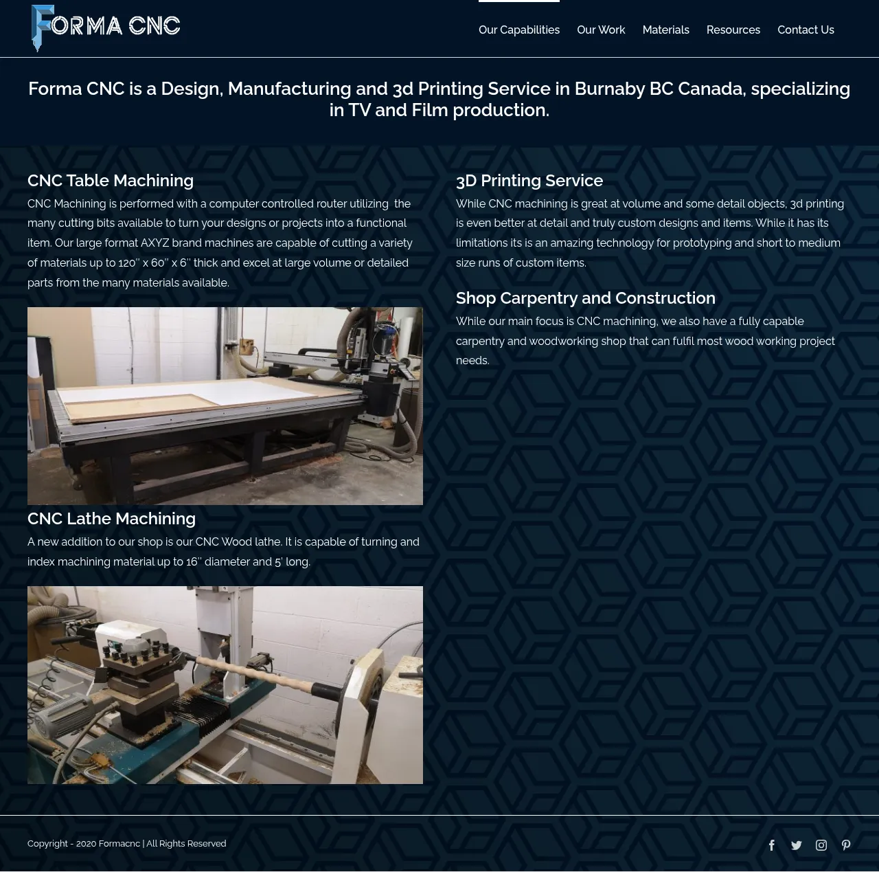Forma CNC is a professional manufacturing facility based in Burnaby, British Columbia, providing specialized services for the television and film production industries. The company offers a diverse range of technical capabilities, including precision CNC table machining, CNC lathe turning, and custom 3D printing for prototyping and short-run production. In addition to advanced machining, they operate a fully equipped carpentry and woodworking shop to support custom construction needs. By leveraging both traditional woodworking and modern additive and subtractive manufacturing, Forma CNC delivers versatile solutions for complex design projects. Their facility is capable of handling a wide array of substrate materials, ensuring technical flexibility for custom client requirements.