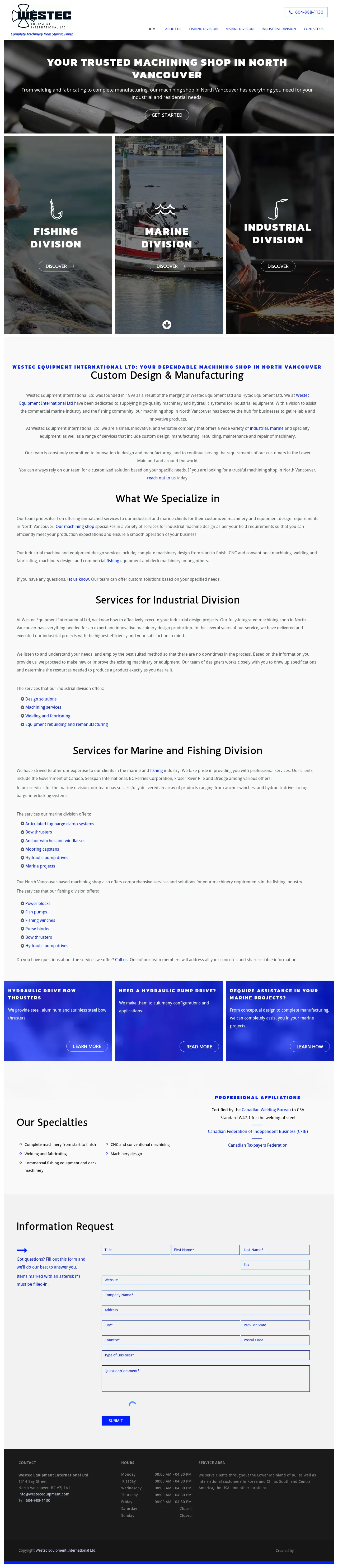 Westec Equipment International Ltd is a North Vancouver-based machining and manufacturing facility specializing in custom design, fabrication, and maintenance of heavy industrial and marine equipment. The company serves the marine, commercial fishing, and general industrial sectors, providing solutions ranging from conceptual design to finished production. Their expertise includes CNC and conventional machining, welding, and complete machinery rebuilding. Committed to innovation, the firm supports a diverse clientele, including government agencies and major maritime corporations, through tailored engineering and manufacturing projects. They maintain a highly integrated facility capable of managing complex, specialized equipment requirements from initial specification to final delivery.