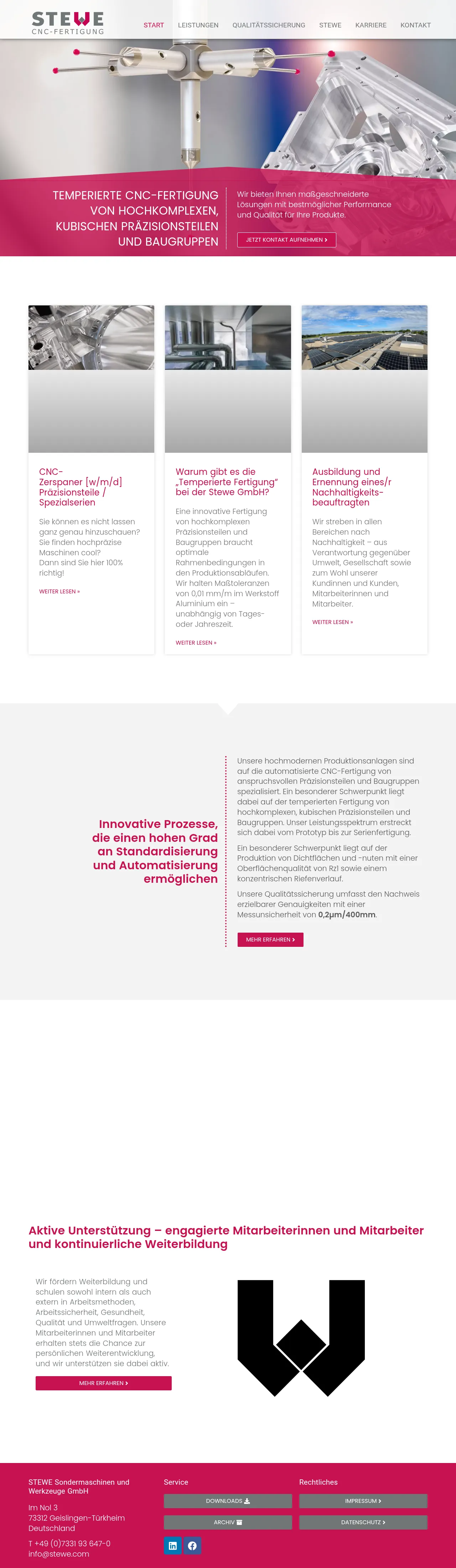 STEWE Sondermaschinen und Werkzeuge GmbH specializes in the temperature-controlled CNC manufacturing of highly complex, cubic precision parts and assemblies. The company provides end-to-end production services ranging from prototype development to full-scale series manufacturing. By utilizing advanced automation and standardized processes, they maintain tight dimensional tolerances of 0.01 mm/m. Their facility is equipped for high-precision metrology to ensure strict adherence to quality specifications. The firm is committed to continuous workforce development and maintains rigorous quality management standards.