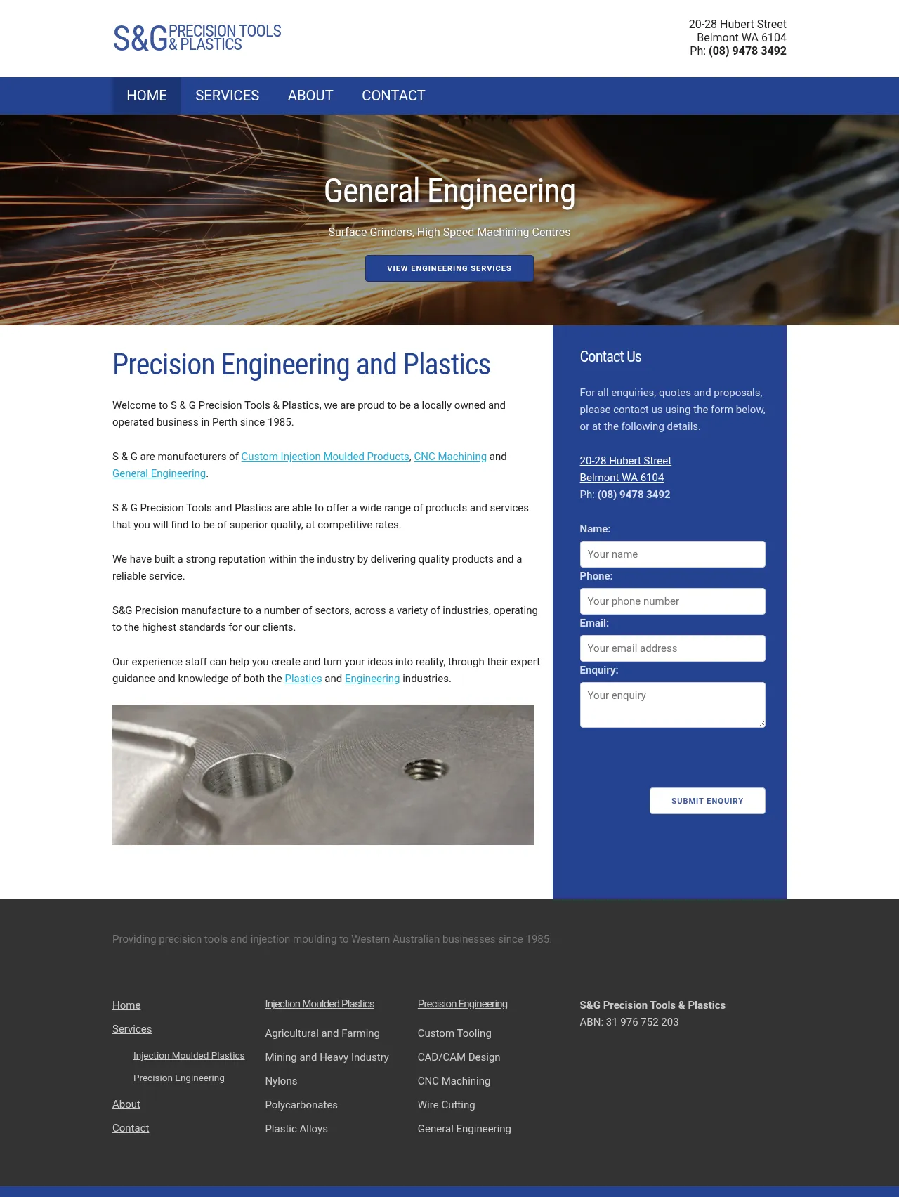 S & G Precision Tools & Plastics is a Perth-based precision engineering and plastics company established in 1985. The business provides CNC machining, toolroom services and plastic injection moulding for custom and production components. They offer CAD/CAM design support and can manufacture parts from customer drawings or assist with product development. Services support agricultural, mining and other industrial applications.