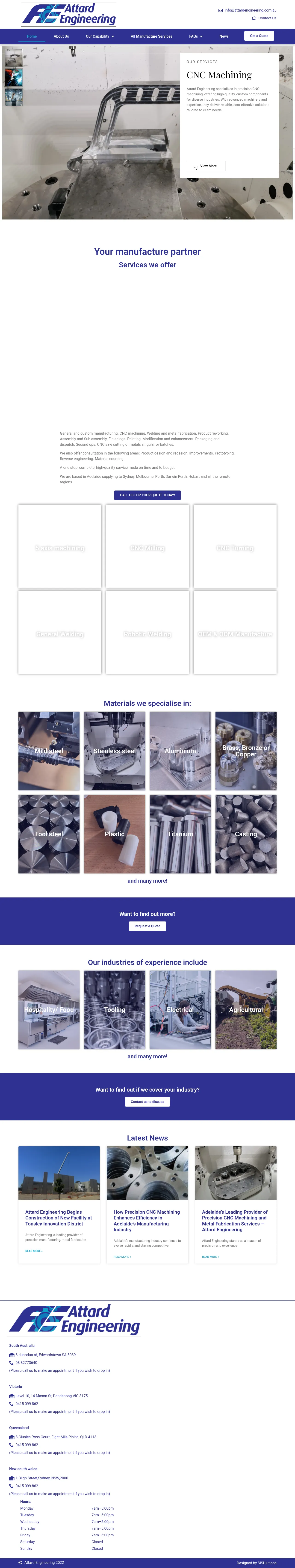 Attard Engineering provides precision CNC machining services for industrial and commercial customers. The company operates automated milling and turning equipment to produce components with tight tolerances and high repeatability. Capabilities include 5-axis machining, CNC milling and turning, and 3D laser cutting for custom, small- to medium-volume production. Operations are based in Edwardstown, South Australia.