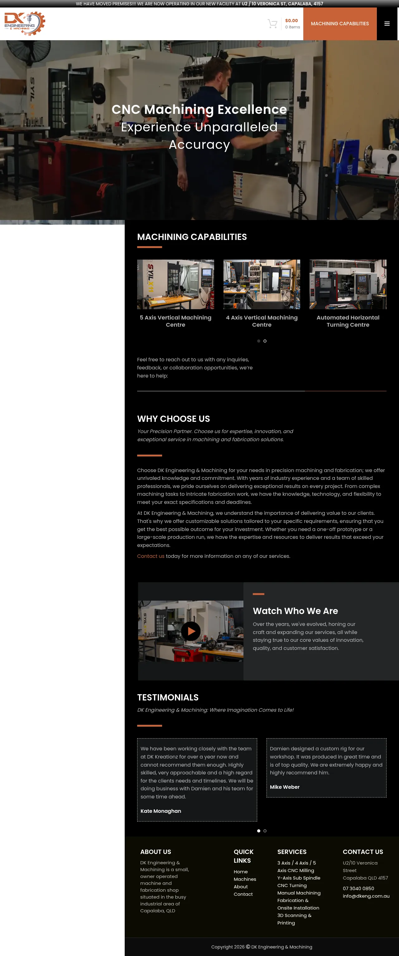 DK Engineering & Machining is a small, owner-operated machine and fabrication shop located in the industrial area of Capalaba, Queensland. The company provides CNC machining and turning services, 3D scanning and printing, metal fabrication, and onsite installation. It supports projects requiring multi-axis milling and sub-spindle turning for precision components.
