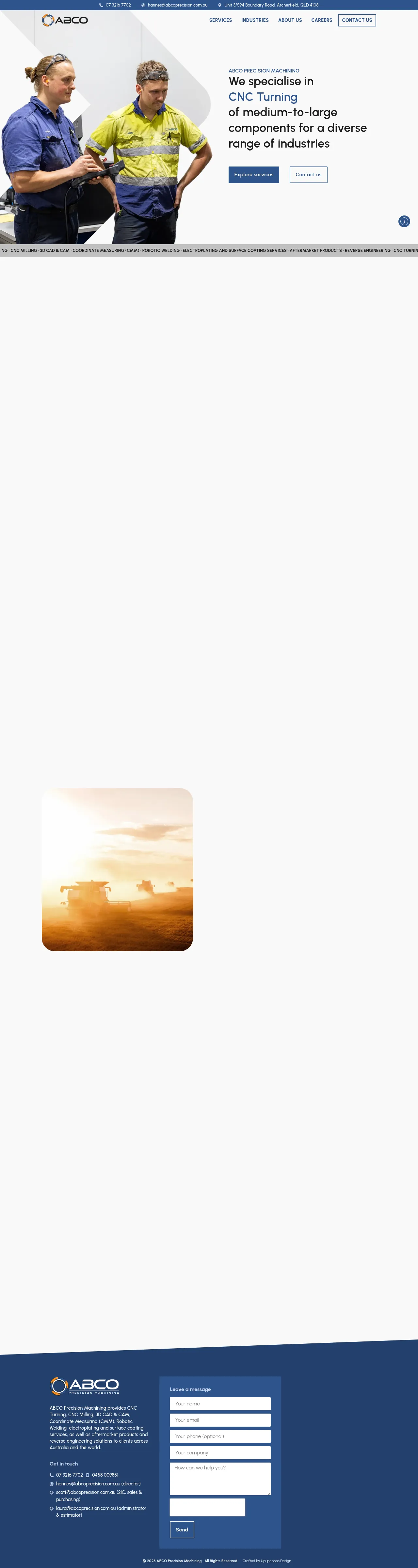 ABCO Precision Machining is a Brisbane-based precision machining company providing CNC milling and turning services. The company also offers 3D CAD/CAM design, reverse engineering, robotic welding, electroplating and surface coating to produce and finish components. It serves heavy industries including mining, supplying durable parts for extraction, processing equipment and supporting infrastructure.