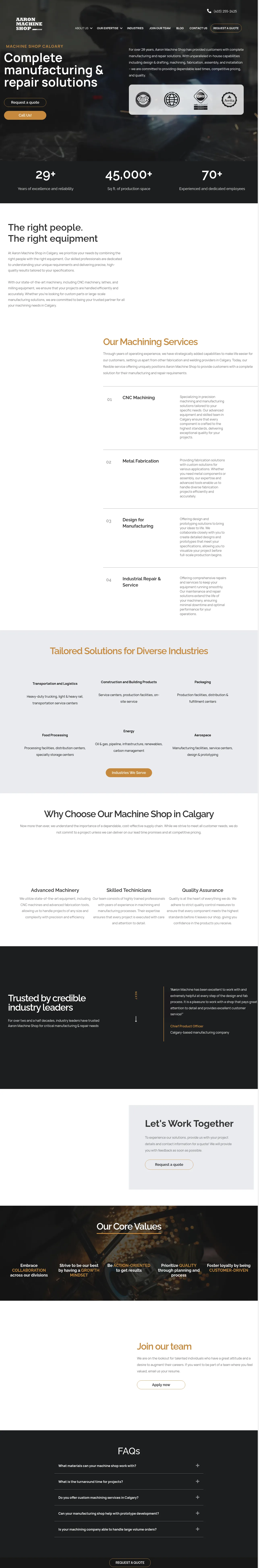 Aaron Machine Shop is an independent Canadian machine shop based in Calgary, Alberta, providing manufacturing, repair and service for metal and plastic components and assemblies since 1996. The company offers in-house design and drafting, CNC machining (milling and turning), fabrication, assembly and installation. Aaron Machine Shop supplies complete manufacturing and repair solutions with an emphasis on reliable lead times and quality workmanship.