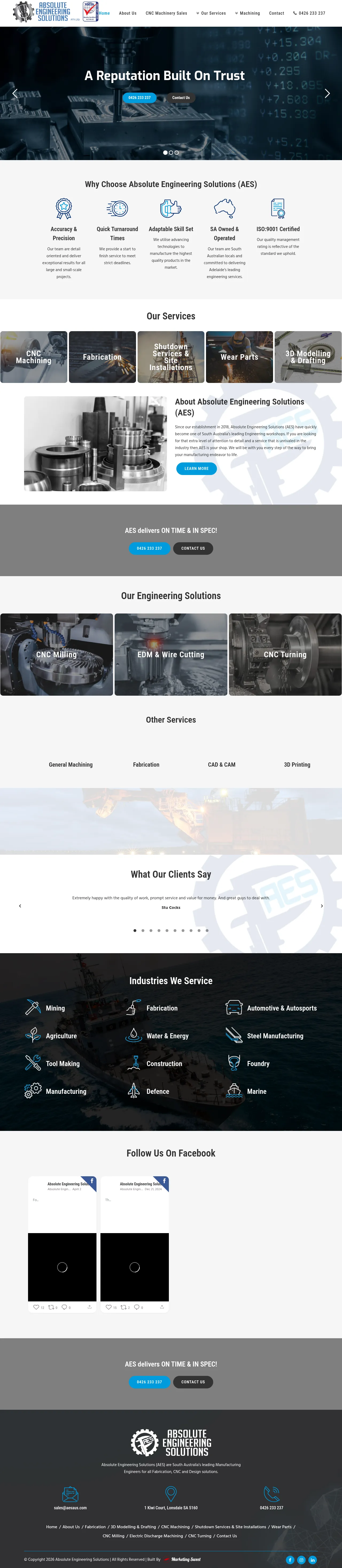 Absolute Engineering Solutions (AES) is a manufacturing engineering firm based in Lonsdale, South Australia. The company provides fabrication, CNC machining, design and component manufacturing services for industrial clients. Capabilities include CNC milling and turning, EDM/wire cutting, 3D modelling and additive manufacturing, and shutdown and site installation support. AES also produces wear parts and offers general machining to support maintenance and production needs.