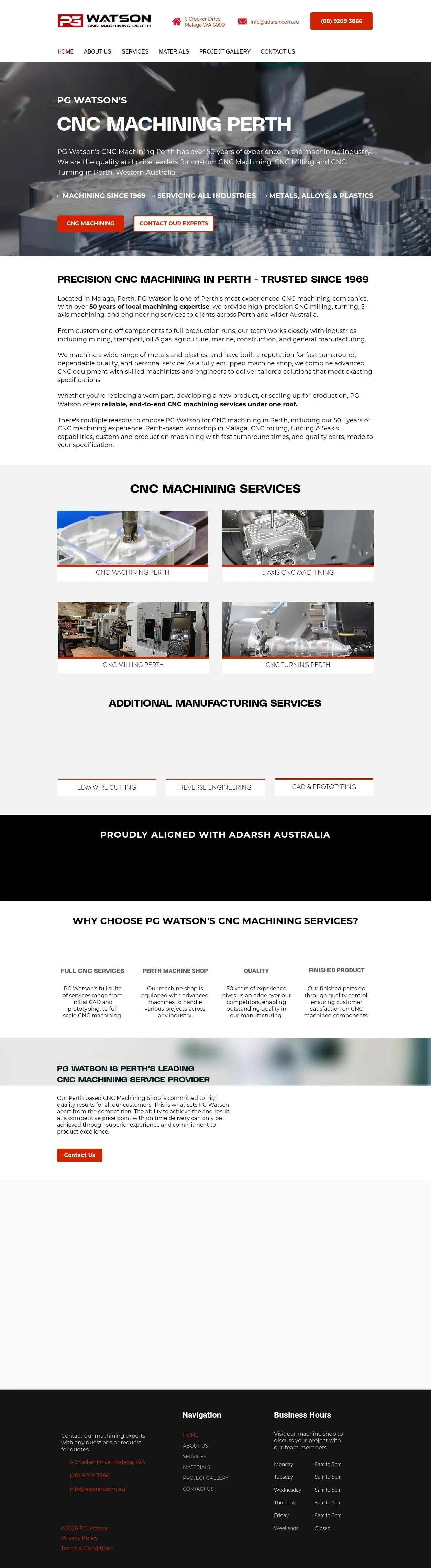 PG Watson is a precision engineering and machine shop based in Malaga, Perth. The company provides manual and CNC machining for short runs, prototypes and full production batches, including milling, turning, multi-axis machining and EDM wire cutting. They also offer reverse engineering and CAD/CAM support for replacement parts and complex components.