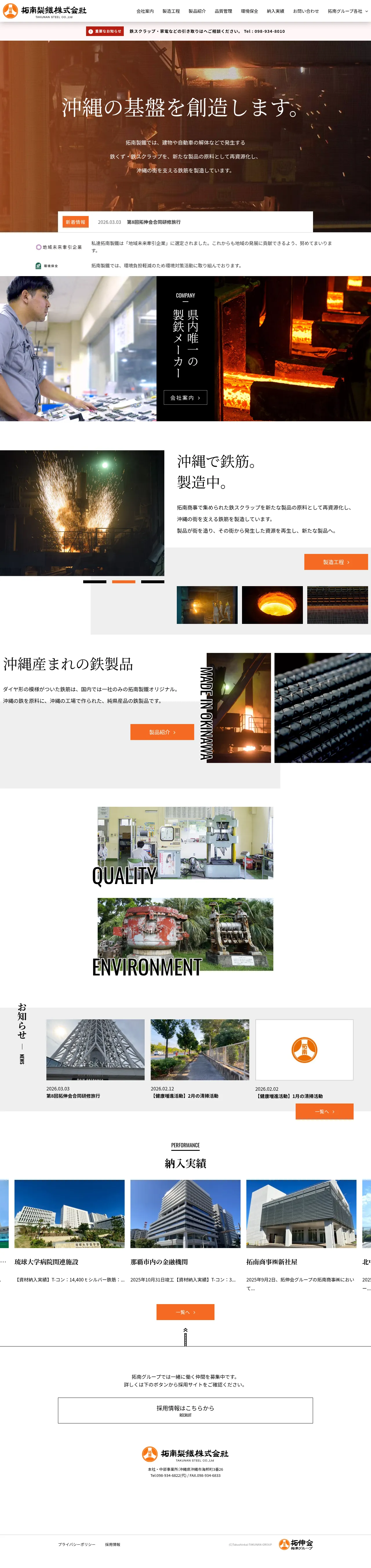 Takunan Steel Co., Ltd. is the sole steel manufacturer in Okinawa, specializing in the recycling of iron scrap into high-quality reinforcement materials. The company supports the regional economy by processing automotive and building waste into steel bars used for construction and civil engineering projects. Their capabilities include electric arc furnace steelmaking, continuous casting, and rolling, complemented by precise quality testing and environmental management systems. Takunan Steel maintains a commitment to sustainable industrial practices, including the production of recycled slag and lime products. The company serves the construction and infrastructure sectors with a focus on producing durable, domestically sourced steel materials adapted to Okinawa's specific environmental conditions.