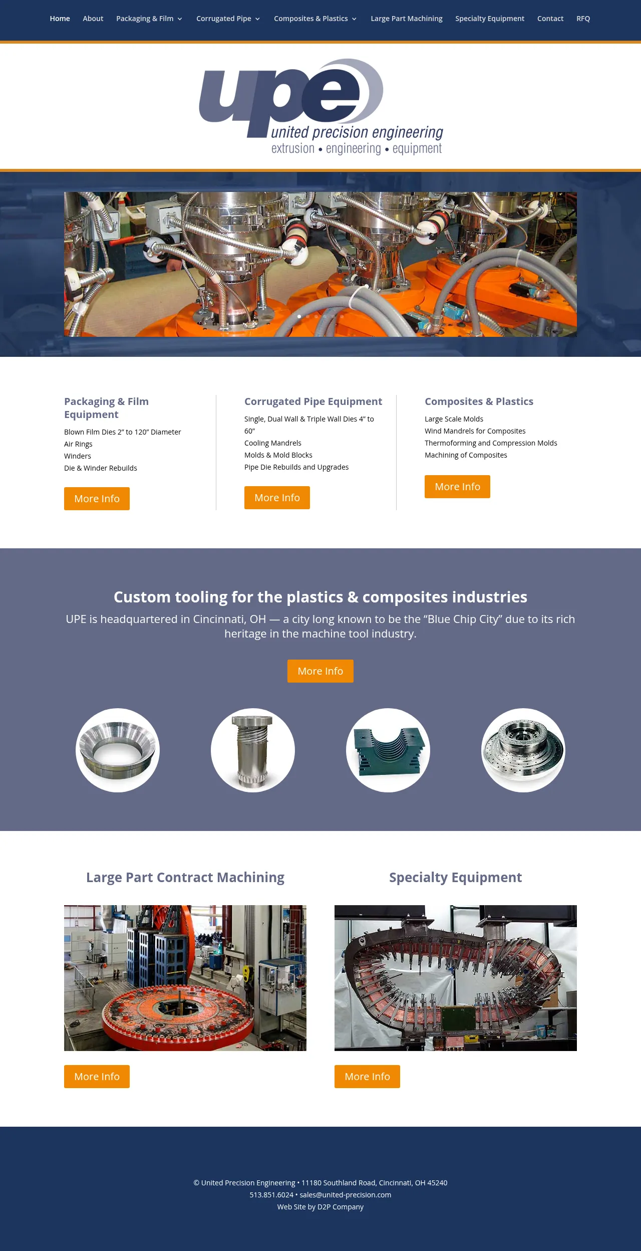 United Precision Engineering is headquartered in Cincinnati, Ohio. The company supplies corrugated and smooth-wall pipe tooling and blown-film equipment to manufacturers of extruded plastic pipe and film. It provides large-part machining, welding, and engineering services and manufactures custom turret and cantilever winders.