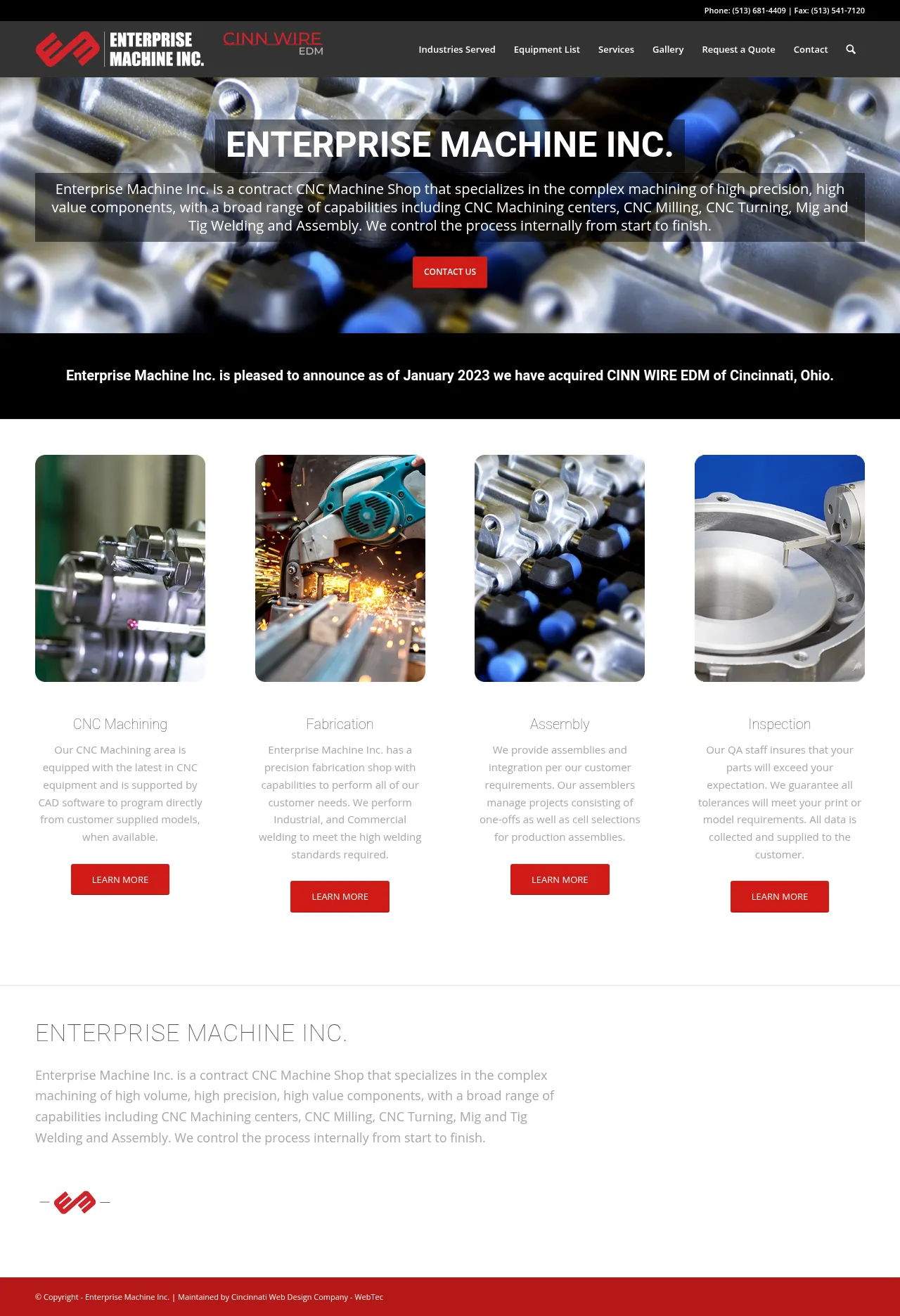 Enterprise Machine Inc. is a contract CNC machine shop that performs complex machining of high-precision, high-value components. The company manages parts production internally from programming through final assembly and inspection. Core capabilities include CNC milling and turning, precision fabrication, MIG and TIG welding, and assembly. It serves aerospace, industrial, and commercial customers requiring high welding and quality standards.