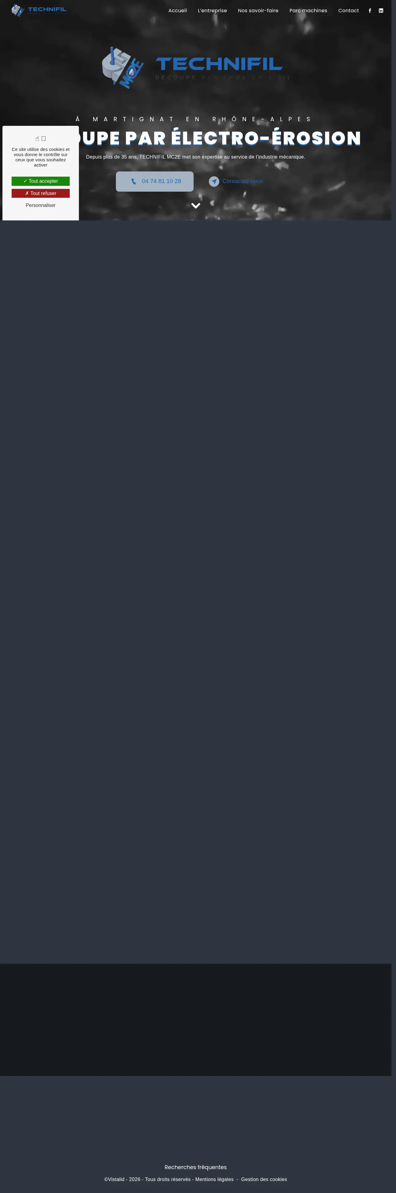 TECHNIFIL MC2E is an industrial manufacturing company based in Martignat, France, specializing in precision mechanical engineering since 1988. The firm focuses on high-precision wire electrical discharge machining (EDM) to produce complex metal components. Their service portfolio includes the design, manufacturing, maintenance, and repair of extrusion blow molding and injection blow molding tooling. Serving diverse technical industries, the company leverages a professional machinery fleet and a team of experienced technicians to ensure precision and repeatability. They offer end-to-end project support, ranging from initial design and consultation to final component delivery.