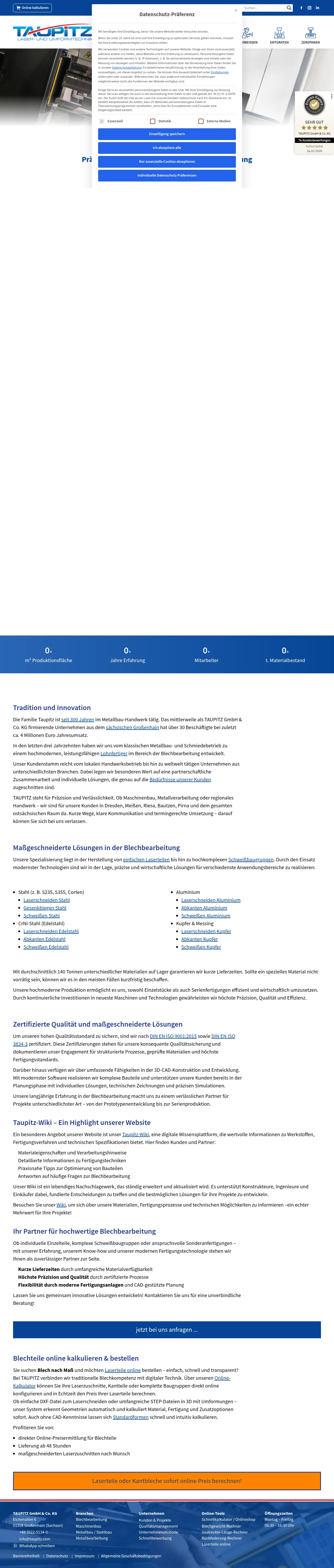 Taupitz provides laser cutting, metal forming and welding services for sheet and tubular components, plus CNC machining and finishing for industrial customers. The company offers an online configurator for instant pricing of laser-cut and bent parts from uploaded DXF or STEP files. Certified welding processes and in-house finishing capabilities support production of complete assemblies. Taupitz maintains a large material stock to enable short lead times.