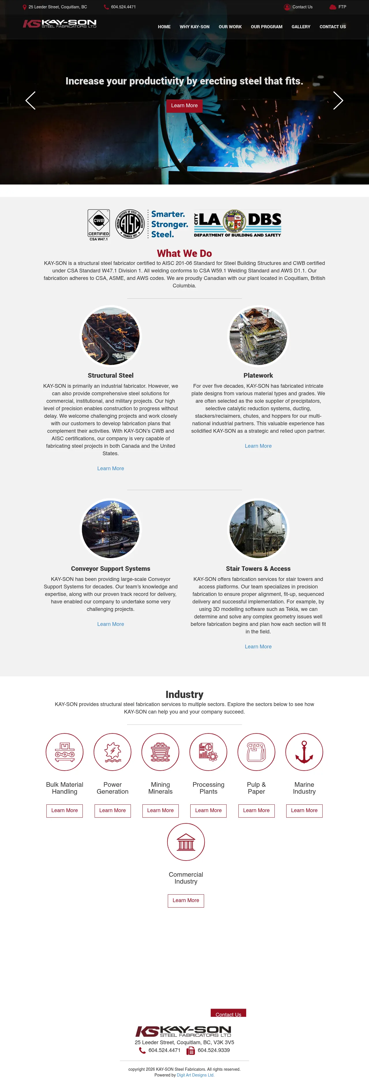 KAY-SON Steel Fabricators is a specialized structural steel fabricator established in 1965, providing comprehensive industrial and commercial fabrication solutions. The company serves a diverse range of sectors including power generation, processing plants, bulk material handling, and marine infrastructure. Their core capabilities include precision structural steel fabrication, platework, conveyor support systems, and professional project management. KAY-SON operates with a strong focus on quality and safety, adhering to rigorous standards to ensure structural integrity and compliance across various regulatory environments in Canada and the United States. They are particularly noted for their expertise in executing large-scale, sequenced industrial projects while maintaining a commitment to zero-accident safety protocols.