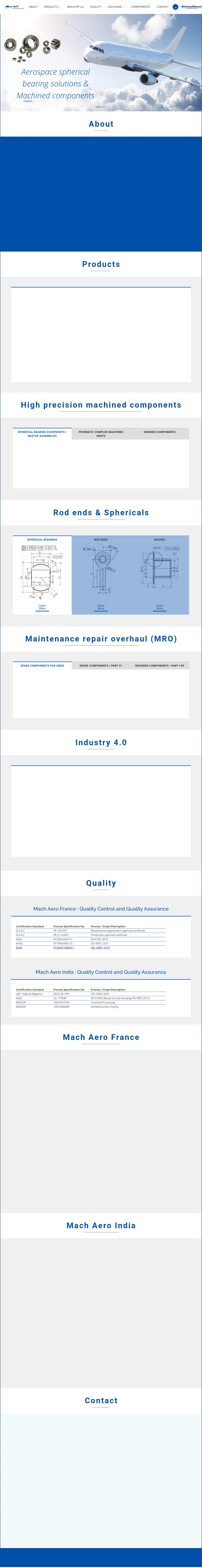 Mach Aero is a specialized manufacturer of high-precision components and sub-assemblies for the aerospace, helicopter, and aircraft engine sectors. With over 60 years of industry experience, the company produces a comprehensive range of spherical bearings, rod ends, bushes, and complex prismatic parts. Operating across facilities in France and India, they provide both mass production for serial components and dedicated Maintenance, Repair, and Overhaul (MRO) services. The company leverages Industry 4.0 digital transformation to optimize manufacturing efficiency and accelerate time-to-market for innovative aeronautical solutions. Their capabilities are supported by in-house specialized processes including non-destructive testing, heat treatment, and chemical processing.