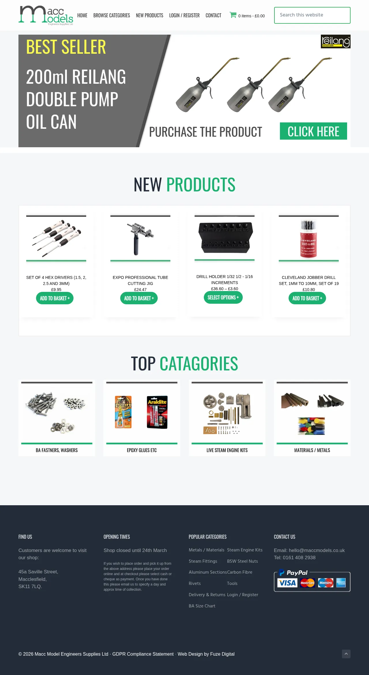 Macc Models specializes in the supply of high-quality materials and components for model engineering and steam enthusiast projects. The company provides a diverse range of fasteners, steam fittings, and specialized tooling designed for precision model assembly. Serving a dedicated community of hobbyists and mechanical engineers, they offer access to essential raw materials and professional-grade cutting and measuring equipment. Their inventory focuses on supporting intricate fabrication tasks through the provision of reliable, small-scale mechanical components. The business operates a physical shop in Macclesfield to assist customers with their technical requirements.