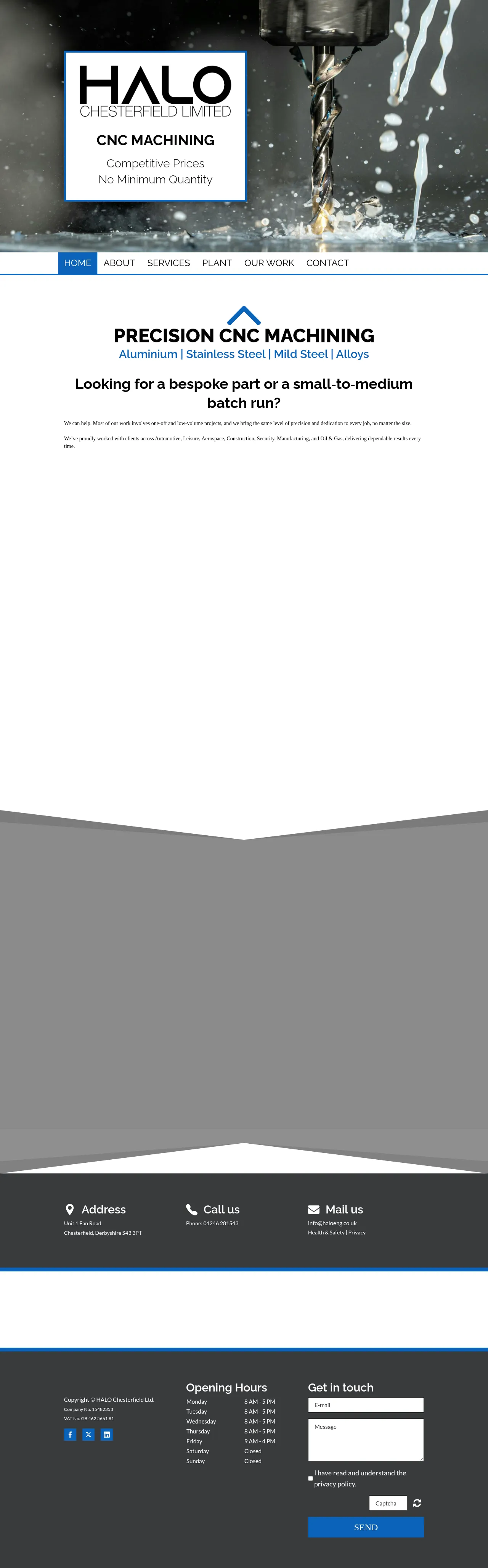 HALO Chesterfield Ltd is a precision engineering company based in Derbyshire, UK, specializing in CNC machining and manufacturing services. The company provides a comprehensive range of solutions including CNC milling, turning, laser marking, and bead blasting for both one-off prototypes and small-batch production. They serve a diverse client base across industries such as aerospace, automotive, rail, and construction. By utilizing advanced CAD/CAM software and a well-equipped facility, the firm ensures high-precision results and full material traceability. They are recognized for their focus on short lead times, competitive pricing, and a customer-oriented approach to complex engineering requirements.