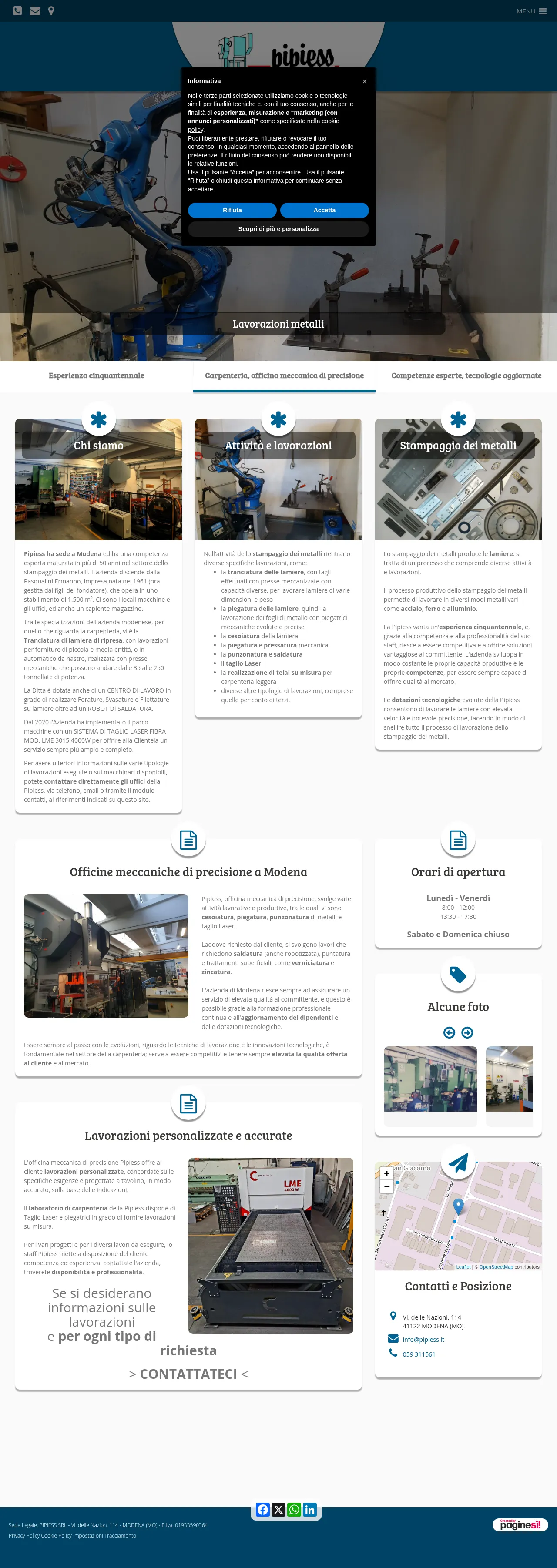 Pipiess is a precision mechanical workshop located in Modena with over 50 years of experience in metal stamping and sheet metal processing. Operating out of a 1,500 square meter facility, the company provides comprehensive manufacturing solutions, including custom fabrication, precision laser cutting, and robotic welding. They serve various industries by offering both small and medium-run production, utilizing advanced machinery to ensure high-quality standards. The firm is recognized for its technical expertise, continuous staff training, and commitment to delivering precise, tailor-made metal components. Pipiess maintains a versatile production environment capable of handling complex sheet metal forming and finishing requirements.