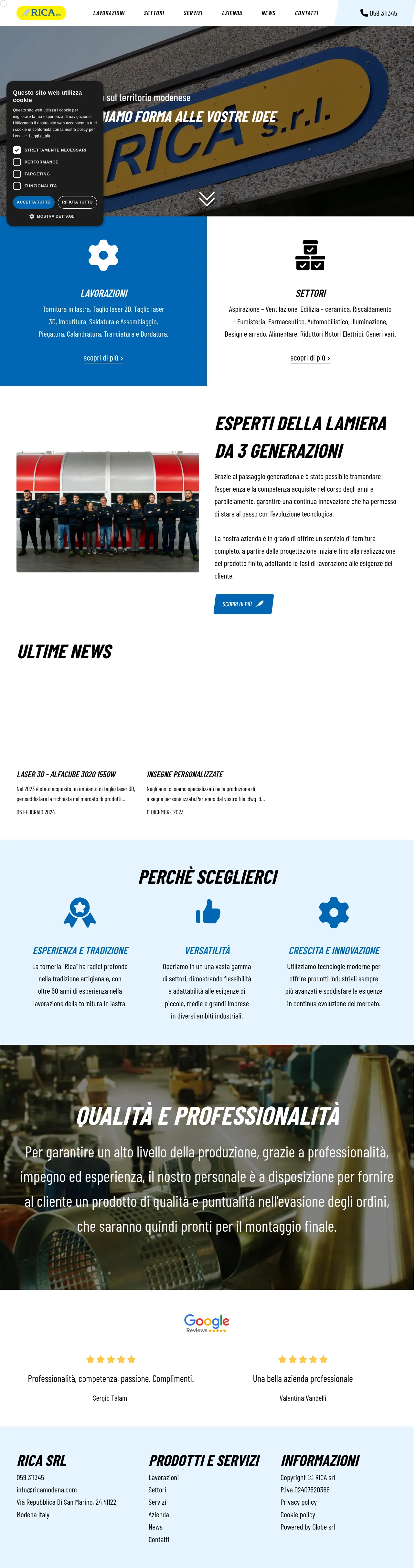 Rica Srl is a third-generation manufacturing company based in Modena, Italy, specializing in metal spinning and sheet metal processing. The company offers a wide range of services, including 2D and 3D laser cutting, deep drawing, welding, assembly, and industrial signage fabrication. With over 50 years of experience, Rica serves a diverse client base by combining traditional metalworking techniques with modern industrial technologies. Their technical department provides comprehensive support for complex manufacturing projects. The facility is equipped to handle iron, stainless steel, and aluminum, delivering finished, ready-to-assemble components.