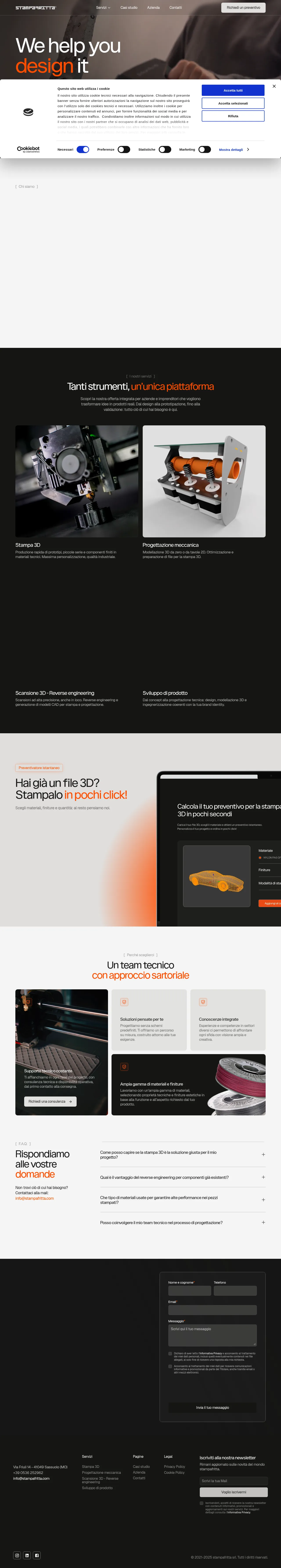 Stampafritta srl is a professional manufacturing firm specializing in on-demand 3D printing, 3D scanning, and mechanical design services. They assist clients throughout the entire production lifecycle, ranging from initial concept development and reverse engineering to final prototyping and small-batch manufacturing. By leveraging advanced additive manufacturing technologies, the company provides tailored engineering solutions across various industrial sectors. Their process integrates technical consultation with precise 3D modeling and CAD development to ensure products meet specific functional and aesthetic requirements. The company emphasizes a flexible, client-focused approach, offering streamlined digital workflows that allow for rapid product validation and iterative design.