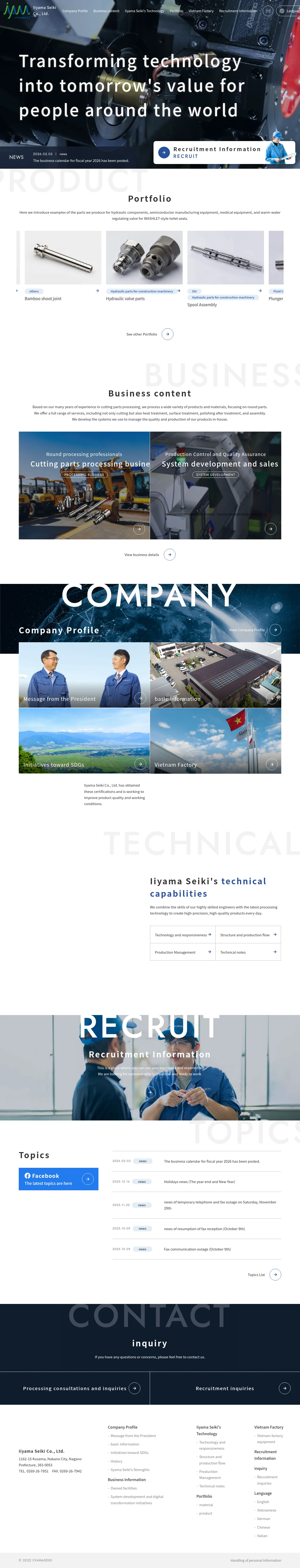 IIYAMA SEIKI CO., LTD. operates precision manufacturing facilities in Japan and Vietnam, including IIYAMA SEIKI VIETNAM Co., Ltd. The company provides high-precision turning and grinding, heat treatment, surface treatments, OD polishing and sub-assembly services. It has extensive experience machining difficult-to-cut materials such as titanium and Kovar and has developed an in-house production management system. IIYAMA SEIKI is certified to ISO 9001 and ISO 14001 in both Japan and Vietnam.