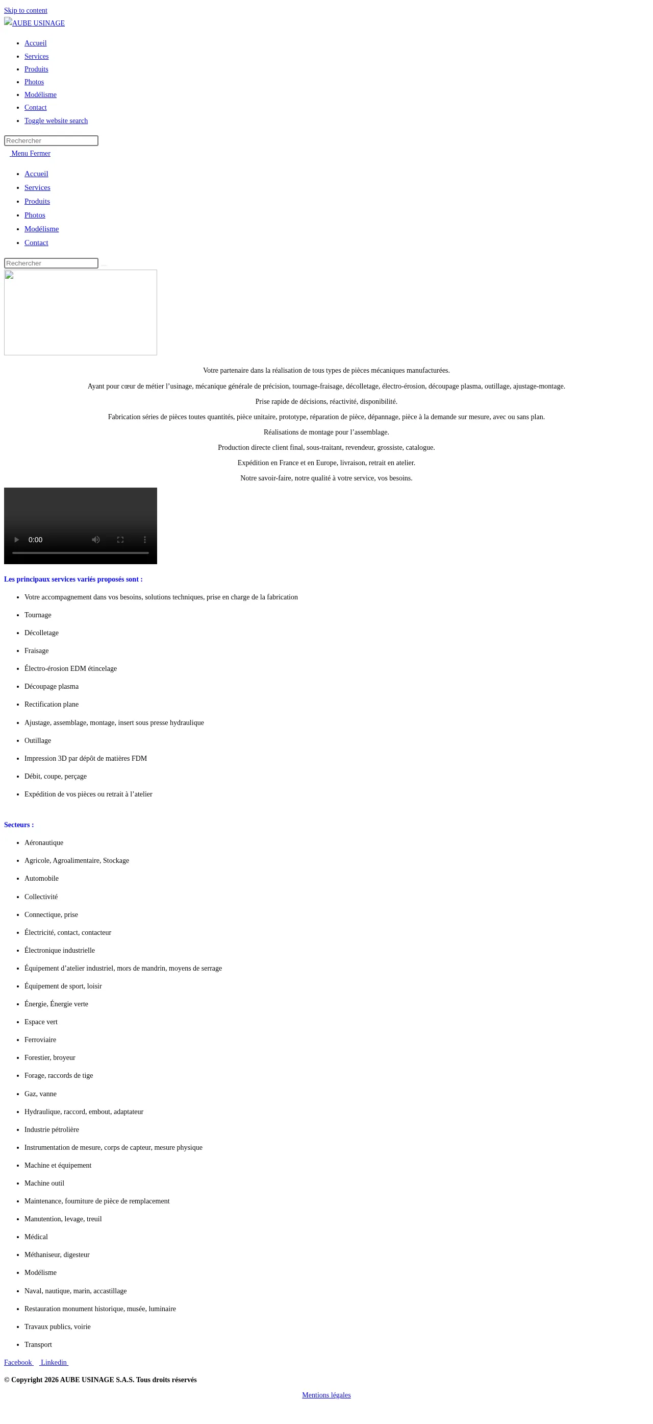 AUBE USINAGE is a French industrial manufacturing company specializing in precision mechanical machining and general mechanics. The firm provides a comprehensive suite of services including turning, milling, screw cutting, wire electrical discharge machining, plasma cutting, and assembly. They serve a diverse range of industries such as aeronautics, agriculture, automotive, rail, energy, and medical. With a focus on both prototyping and small-batch production, the company offers custom design, technical support, and rapid manufacturing solutions. They accommodate clients ranging from individual end-users to wholesalers and industrial sub-contractors, providing both national and international shipping options.