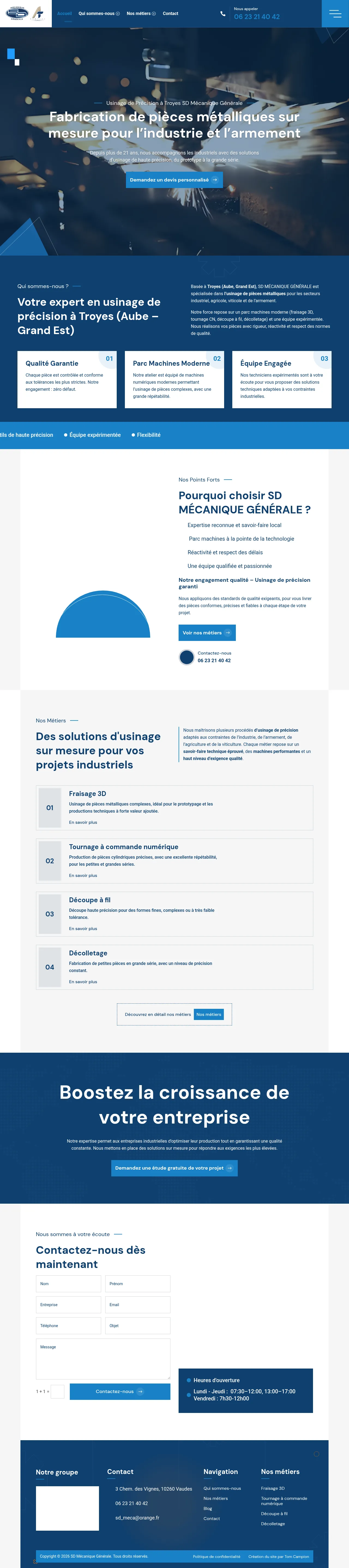 SD Mécanique Générale is a French precision machining company based in Troyes, specializing in the manufacturing of complex metallic components. With over two decades of experience, the company provides end-to-end solutions ranging from prototyping to large-scale production. They serve diverse industrial sectors, including defense, agriculture, and viticulture. Their operations are supported by a modern machine park and rigorous quality control protocols aimed at ensuring high-precision tolerances. The team focuses on providing customized technical support to meet specific industrial requirements while maintaining consistent repeatability.
