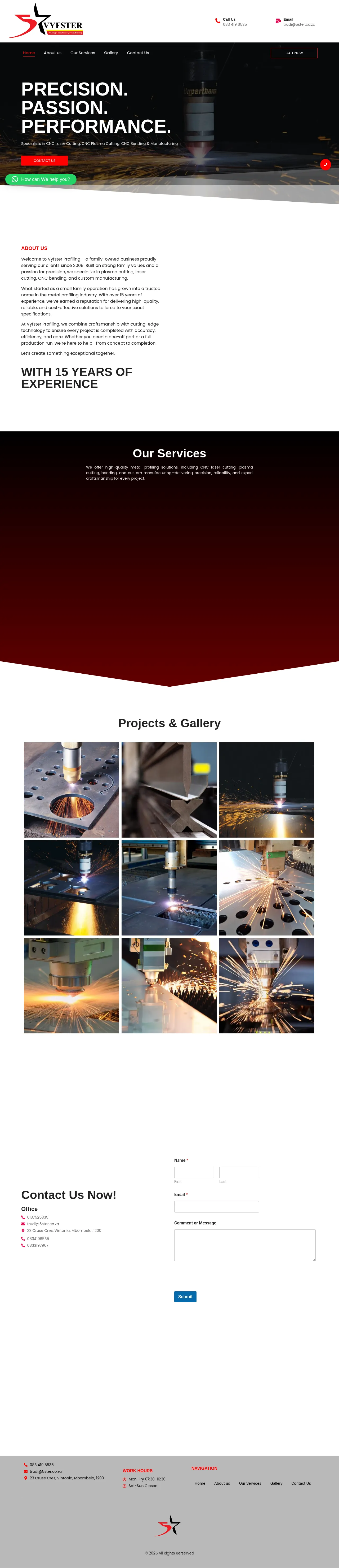 Vyfster Profiling is a family-owned metal fabrication business established in 2008. The company specializes in precision CNC laser and plasma cutting, as well as CNC bending services for a variety of metal components. Serving a diverse range of project scales, they cater to both one-off prototypes and large-volume production runs. Their facility is equipped to handle complex designs for industrial and custom applications with high dimensional accuracy. With over 15 years of operational experience, the company focuses on providing cost-effective manufacturing solutions and consistent quality control.