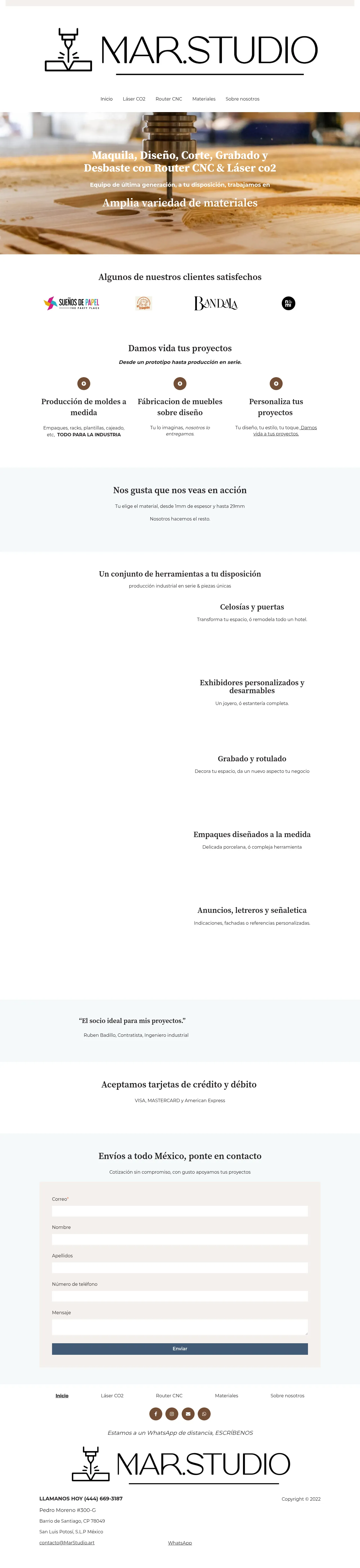 MarStudio is a specialized manufacturing company based in San Luis Potosí, Mexico, offering expert laser and CNC routing services. The company provides design, fabrication, and custom machining for a variety of sectors, including commercial interior design, retail display production, and signage. They utilize high-precision CO2 laser systems and CNC routers to process materials for projects ranging from furniture and architectural lattices to custom packaging and industrial parts. MarStudio focuses on delivering tailored manufacturing solutions, supporting clients from design conception through to final production. They offer regional shipping across Mexico and provide technical consultation for custom projects.