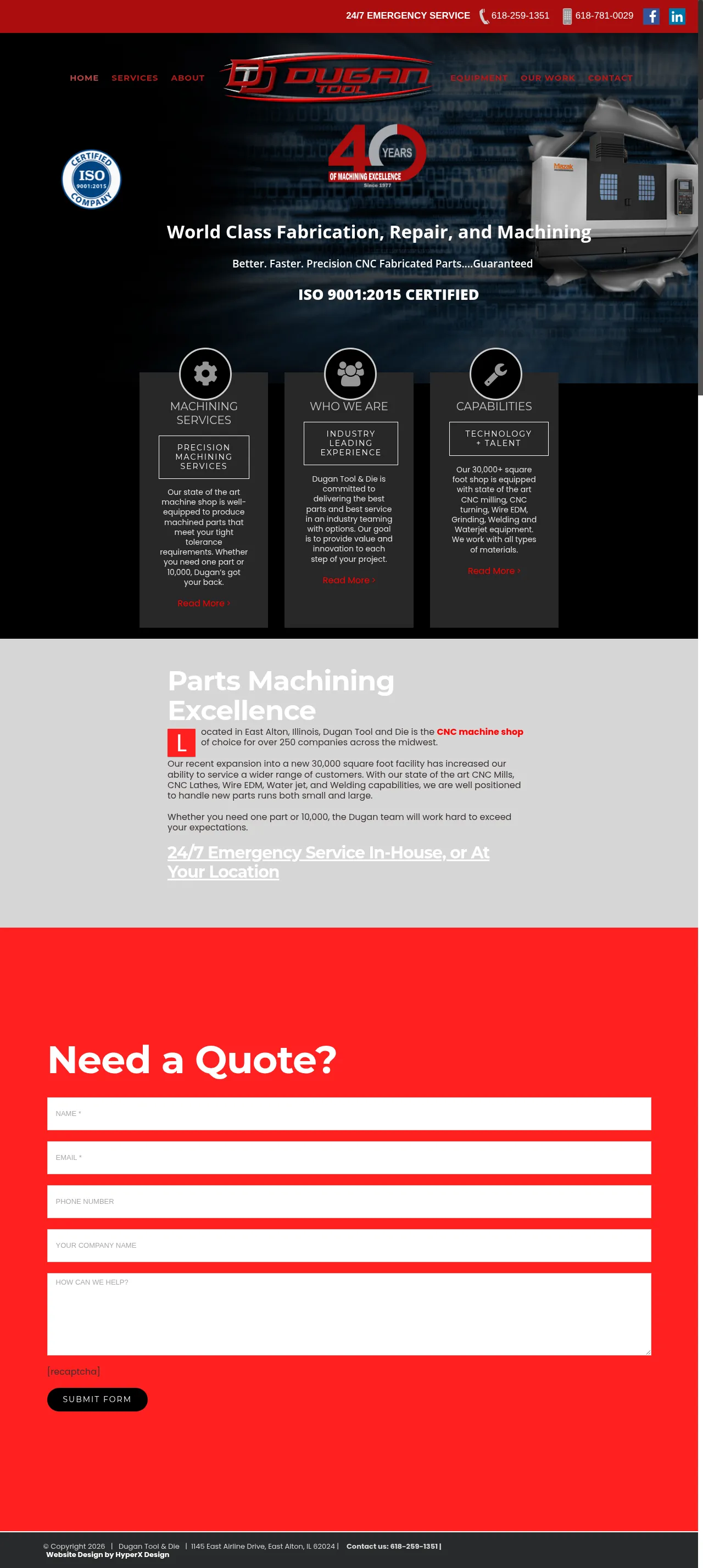 Dugan Tool and Die is an industrial machining and fabrication facility located in East Alton, Illinois, serving over 250 companies across the Midwest. The company provides a full range of services including precision CNC milling, CNC turning, Wire EDM, grinding, welding, and waterjet cutting. Their 30,000-square-foot facility is equipped to handle both low-volume prototyping and large-scale production runs requiring tight tolerances. In addition to machining, they offer industrial valve testing, mechanical design, and comprehensive equipment repair services. The firm maintains 24/7 emergency response capabilities to support customers with urgent onsite or in-house technical needs.
