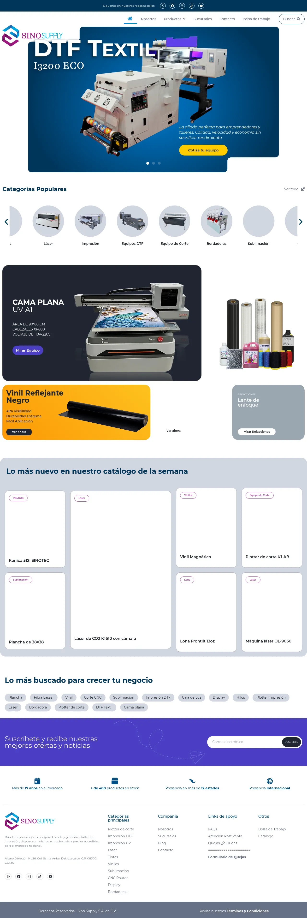 SinoSupply S.A. de C.V. is an industrial supplier specializing in high-performance machinery and consumables for the advertising and commercial graphics sectors. Established in 2005, the company provides a comprehensive range of equipment including CNC routers, laser cutting systems, and large-format printing plotters. They serve a global market with a significant operational presence in Mexico, Colombia, and Peru, offering solutions for UV printing, textile sublimation, and 3D display fabrication. The firm focuses on delivering advanced technology and technical maintenance services to both small businesses and large industrial enterprises.