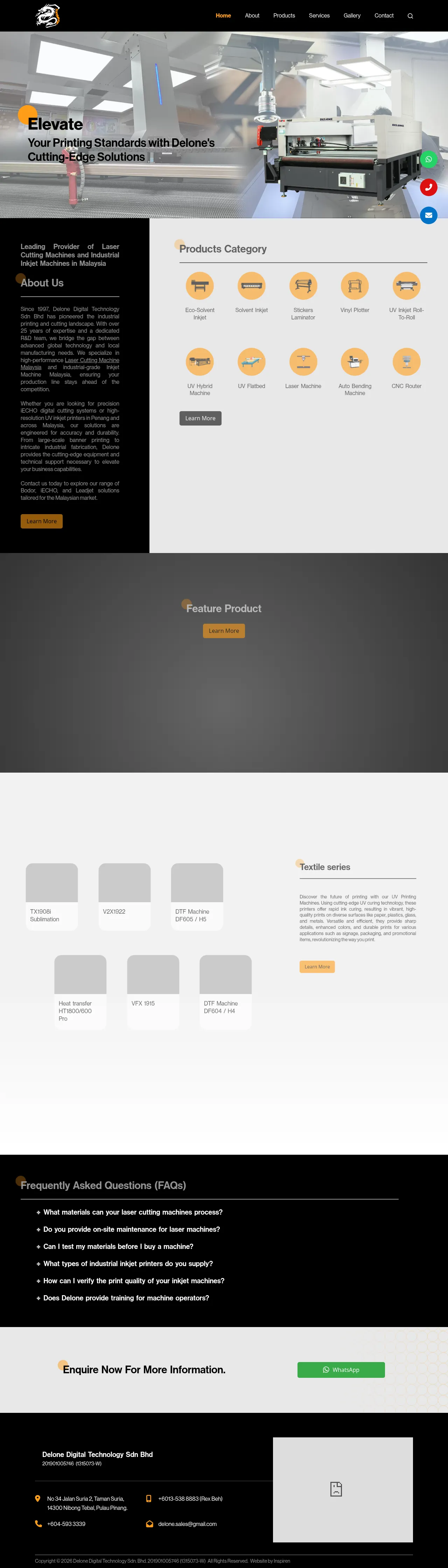 Delone provides comprehensive industrial solutions for laser cutting and digital printing across various manufacturing sectors. The company distributes fiber laser systems for metal processing and CO2 lasers for materials such as wood, acrylic, and textiles. Their capabilities extend to high-precision multi-layer cutting and high-resolution industrial inkjet printing on surfaces like glass and plastic. Beyond equipment supply, the firm offers on-site technical maintenance and repair services throughout Malaysia to maximize operational efficiency. They specialize in serving the signage, packaging, and promotional industries with advanced UV curing and printing technologies.