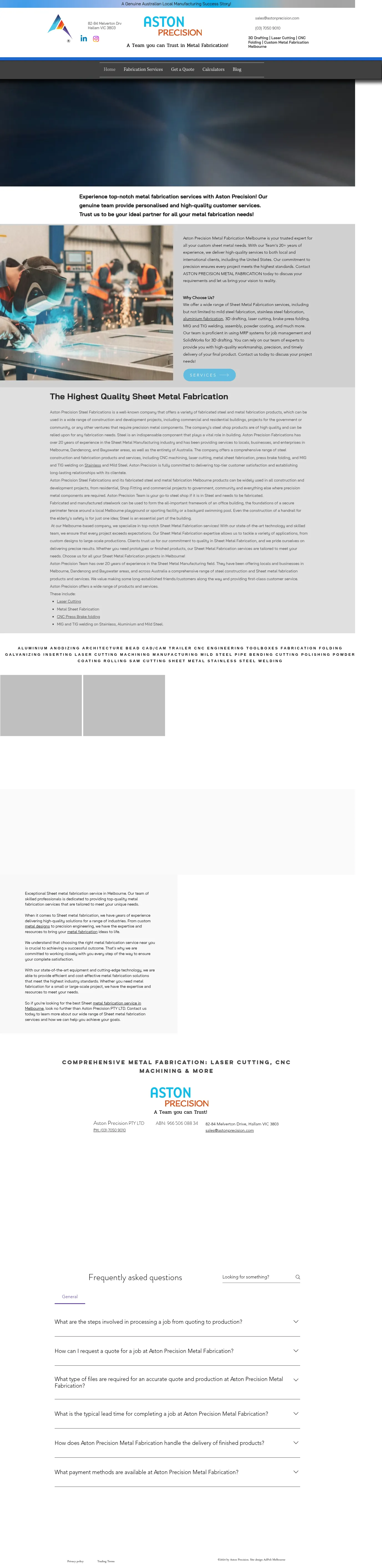 Aston Precision is a specialized metal fabrication company based in Hallam, Victoria, providing custom sheet metal solutions to clients across Australia. The company offers a comprehensive range of services including CNC laser cutting, press brake folding, MIG and TIG welding, and 3D CAD drafting. They serve a diverse array of sectors, including construction, automotive, aerospace, and defense, handling projects from initial design and prototyping to mass production. By utilizing advanced software such as SolidWorks and modern manufacturing equipment, the company maintains high standards for precision and structural integrity. Aston Precision distinguishes itself through a consultative approach, helping clients optimize designs for manufacturability and cost-efficiency.