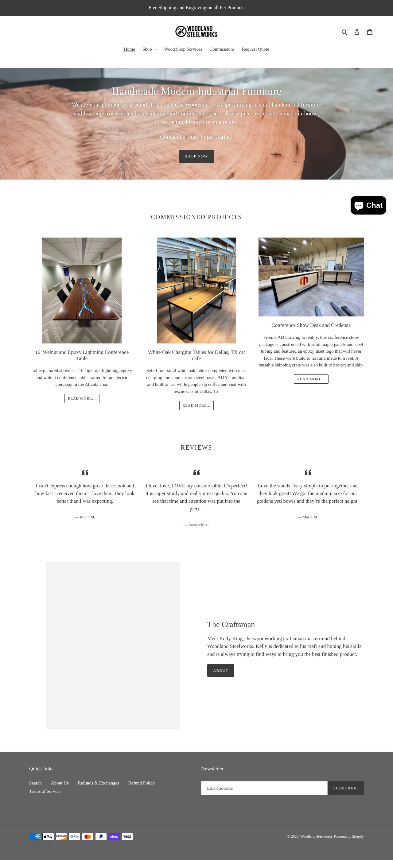 Woodland Steelworks is a custom wood and metal fabrication shop based in Woodstock, Georgia. The company specializes in designing and manufacturing handcrafted furniture, including conference tables, coffee tables, desks, and bespoke decor for residential and commercial clients. Their capabilities range from CAD design and prototyping to production runs, utilizing both traditional woodworking and advanced digital fabrication techniques. They offer custom sizing, finishing, and material selection, ensuring each piece is tailored to specific project requirements. Their workshop is equipped to handle complex projects involving mixed-material construction and custom metalwork.