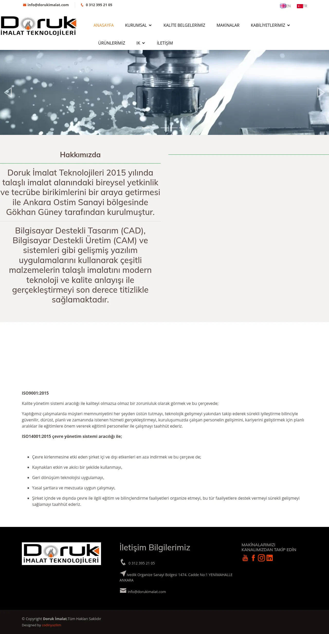 Doruk İmalat Teknolojileri is a machining company established in 2015 in the Ostim industrial zone of Ankara. The firm performs precision subtractive manufacturing using advanced CAD and CAM systems and modern machining technology. It operates under quality and environmental management systems (ISO9001:2015 and ISO14001:2015).