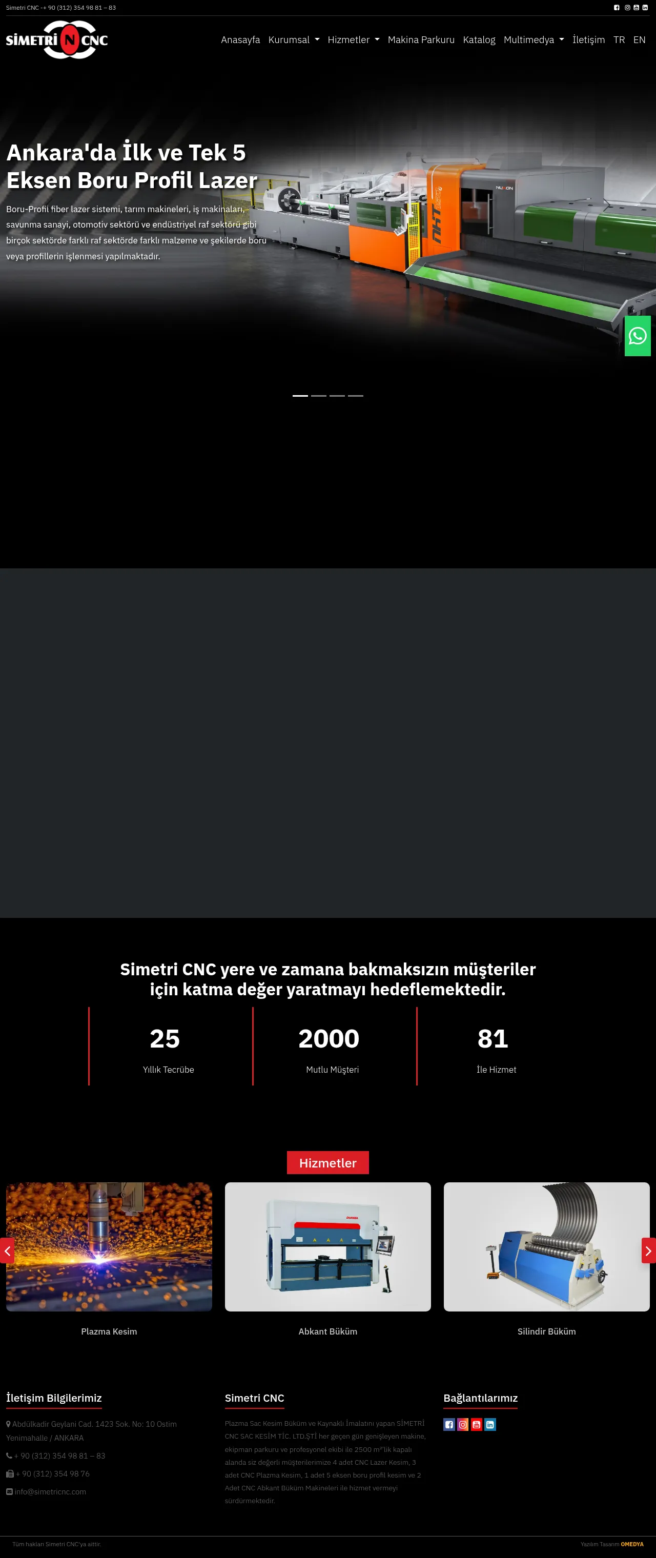SİMETRİ CNC provides sheet metal cutting, bending and welded fabrication services from its facility in Ankara. The company operates a machine park that includes CNC laser and plasma cutters, a 5-axis pipe/profile laser cutter and CNC press brakes within a 2,500 m² covered production area. It supplies fabricated metal components and assemblies for customers across locations, emphasizing continuous production capability.