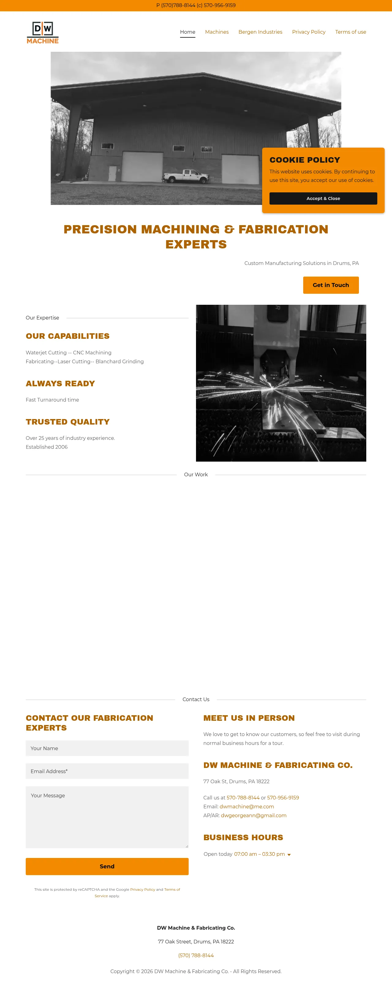 DW Machine is a custom manufacturing facility based in Drums, Pennsylvania, specializing in precision fabrication and machining services. Since 2006, the company has provided industrial solutions including laser cutting, CNC machining, and waterjet cutting to meet diverse client requirements. They operate a modern shop floor featuring a wide array of vertical and horizontal machining centers, CNC lathes, and heavy-duty grinding capabilities. With over 25 years of industry experience, the firm emphasizes fast turnaround times and high-quality production standards. Their facility is equipped to handle complex projects, offering both manual and automated production options to support industrial manufacturing needs.