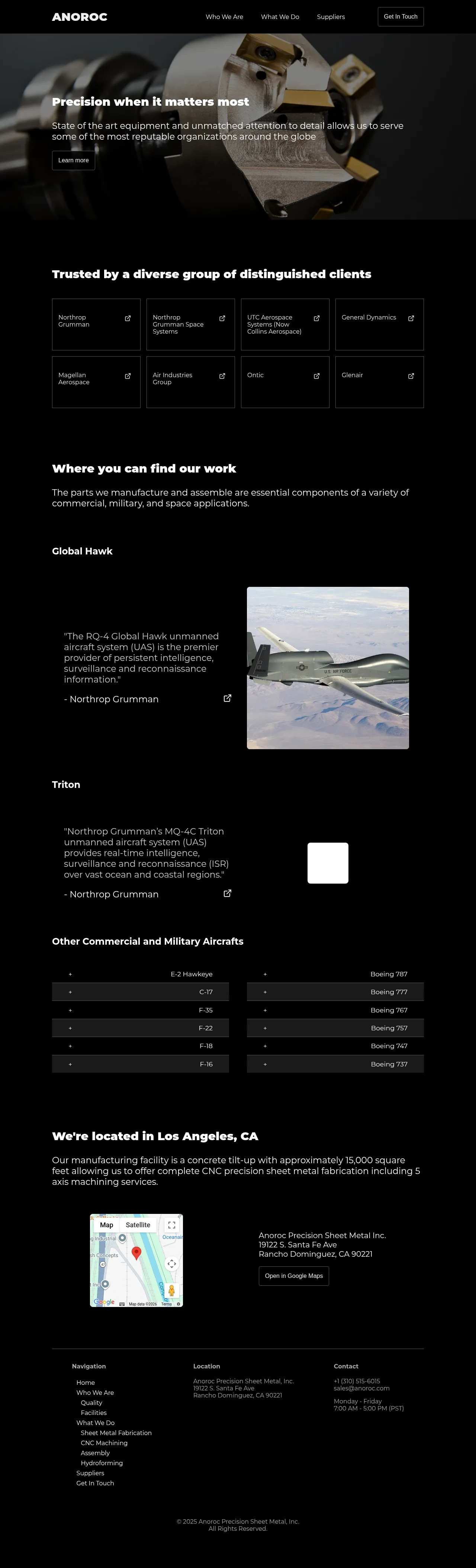 Anoroc Precision Sheet Metal is a specialized manufacturer providing high-precision sheet metal fabrication and assembly services. Operating from a 15,000-square-foot facility, the company supports a diverse range of critical sectors, including aerospace, defense, and space exploration. They have extensive experience supplying components for unmanned aircraft systems and commercial aviation fleets. Anoroc utilizes advanced manufacturing techniques to meet the stringent quality standards required by major global organizations. Their production capabilities are designed to deliver reliable parts for high-stakes military and industrial applications.