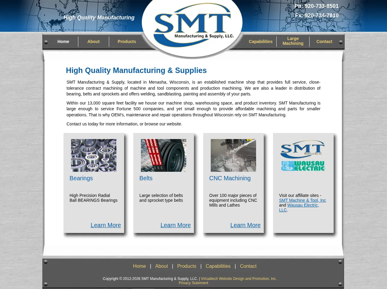 SMT Manufacturing operates a 13,000-square-foot facility providing comprehensive contract machining and warehousing services. The company specializes in large-scale machining and precision CNC operations to support a wide range of industrial clients. Serving sectors including original equipment manufacturing and maintenance, they balance capacity for Fortune 500 contracts with flexible solutions for smaller operations. Their service area encompasses Wisconsin, with a focus on delivering high-quality, reliable machined parts. The organization leverages an extensive array of production equipment to maintain efficient turnaround times.