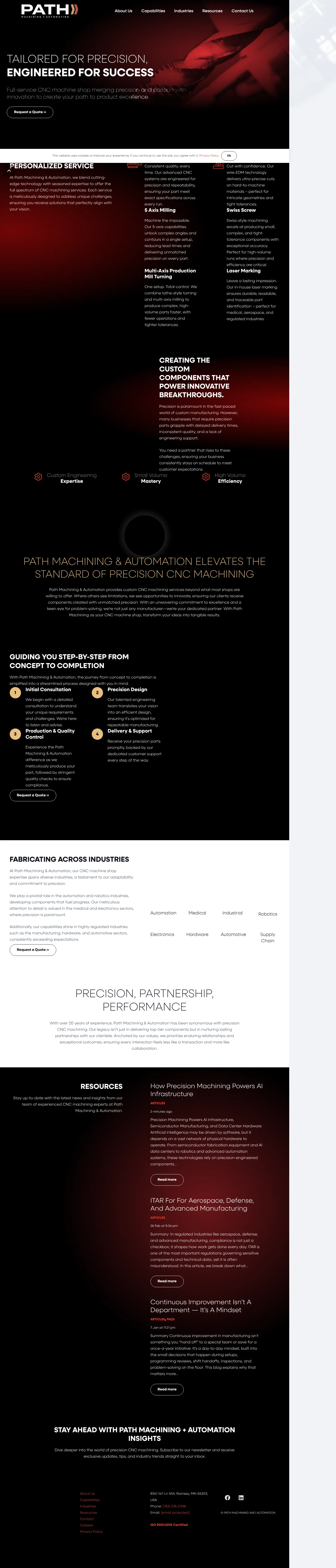 Path Machining and Automation is a full-service CNC machine shop based in Minnesota, specializing in precision manufacturing for complex components. The company serves a diverse range of industries, including medical, aerospace, robotics, automotive, and electronics. Their core capabilities encompass 5-axis machining, EDM, and Swiss-style turning, supported by advanced engineering and in-house laser marking. Operating from a 45,000-square-foot facility, the shop utilizes multi-shift production to manage both small-volume prototyping and high-volume manufacturing requirements. They distinguish themselves through a commitment to rapid fulfillment, rigorous quality control, and collaborative engineering partnerships.