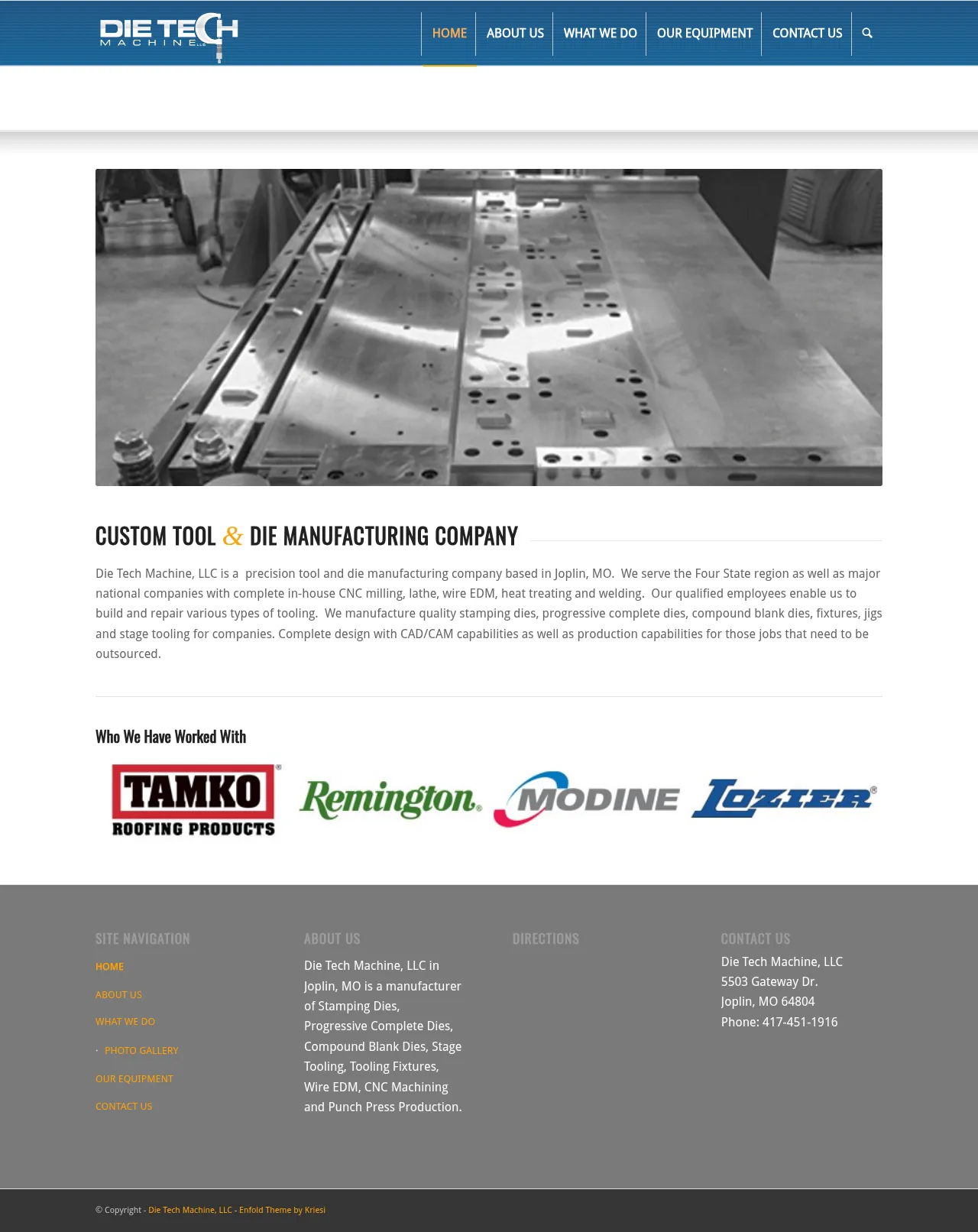 Die Tech Machine, LLC is a specialized manufacturer based in Joplin, Missouri, focused on custom tooling and die production. The company provides a comprehensive range of metal forming solutions, including the design and fabrication of stamping, progressive, and compound blank dies. In addition to tool and die work, they offer professional CNC machining and stage tooling services. The facility is equipped to handle both precision component manufacturing and punch press production requirements. They serve a diverse client base by leveraging advanced machining processes to deliver high-quality industrial components.