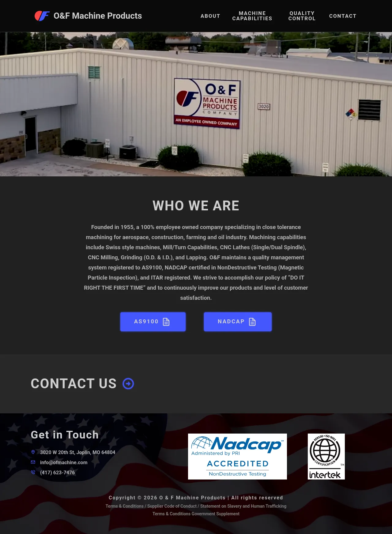Established in 1955, O.F. Machine is an industrial manufacturing firm based in Joplin, Missouri. The company specializes in high-precision machining services tailored for the aerospace, military, defense, and commercial sectors. With a history of continuous development and expansion, they support critical manufacturing requirements for both space and defense applications. The organization is committed to strict quality standards and precision engineering to meet the complex demands of their industrial partners.