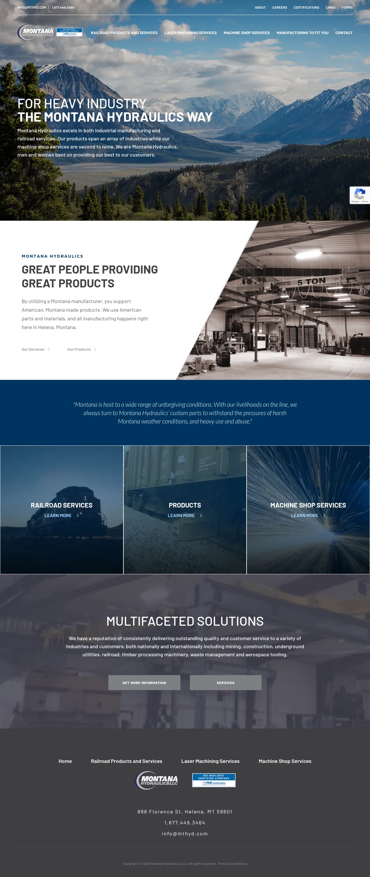 Montana Hydraulics is a precision manufacturer and service provider specializing in custom solutions for heavy industry, including mining, construction, aerospace, and rail sectors. The company operates a full-service machine shop based in Helena, Montana, utilizing domestically sourced materials for all production projects. Their core capabilities include specialized railroad infrastructure support and advanced machining services designed for industrial applications. Montana Hydraulics emphasizes a commitment to international quality standards while maintaining a focus on American-made manufacturing. The facility provides comprehensive support ranging from bespoke aerospace tooling to large-scale timber processing equipment repair.