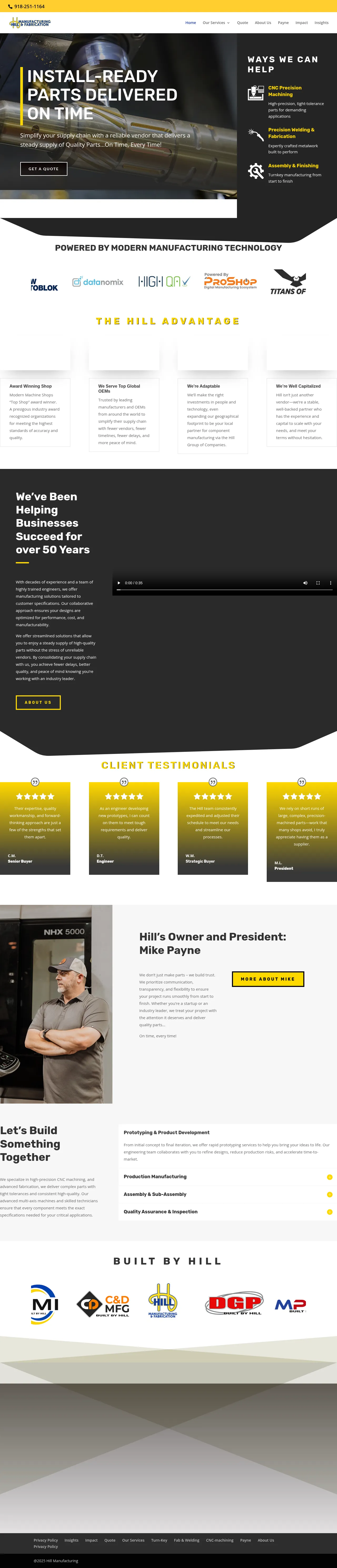 Hill Manufacturing is a precision machining and fabrication company founded in 1976, currently based in Broken Arrow, Oklahoma. The company provides turn-key manufacturing solutions including CNC machining, fabrication, welding, assembly, and rapid prototyping services. They support a diverse range of industries such as aerospace, military, renewable energy, and industrial equipment. By emphasizing rigorous quality control and supply chain consolidation, the firm assists OEMs and manufacturers in managing production needs from prototype to high-volume runs. The organization is recognized for its commitment to technical investment and operational scalability to meet custom project requirements.