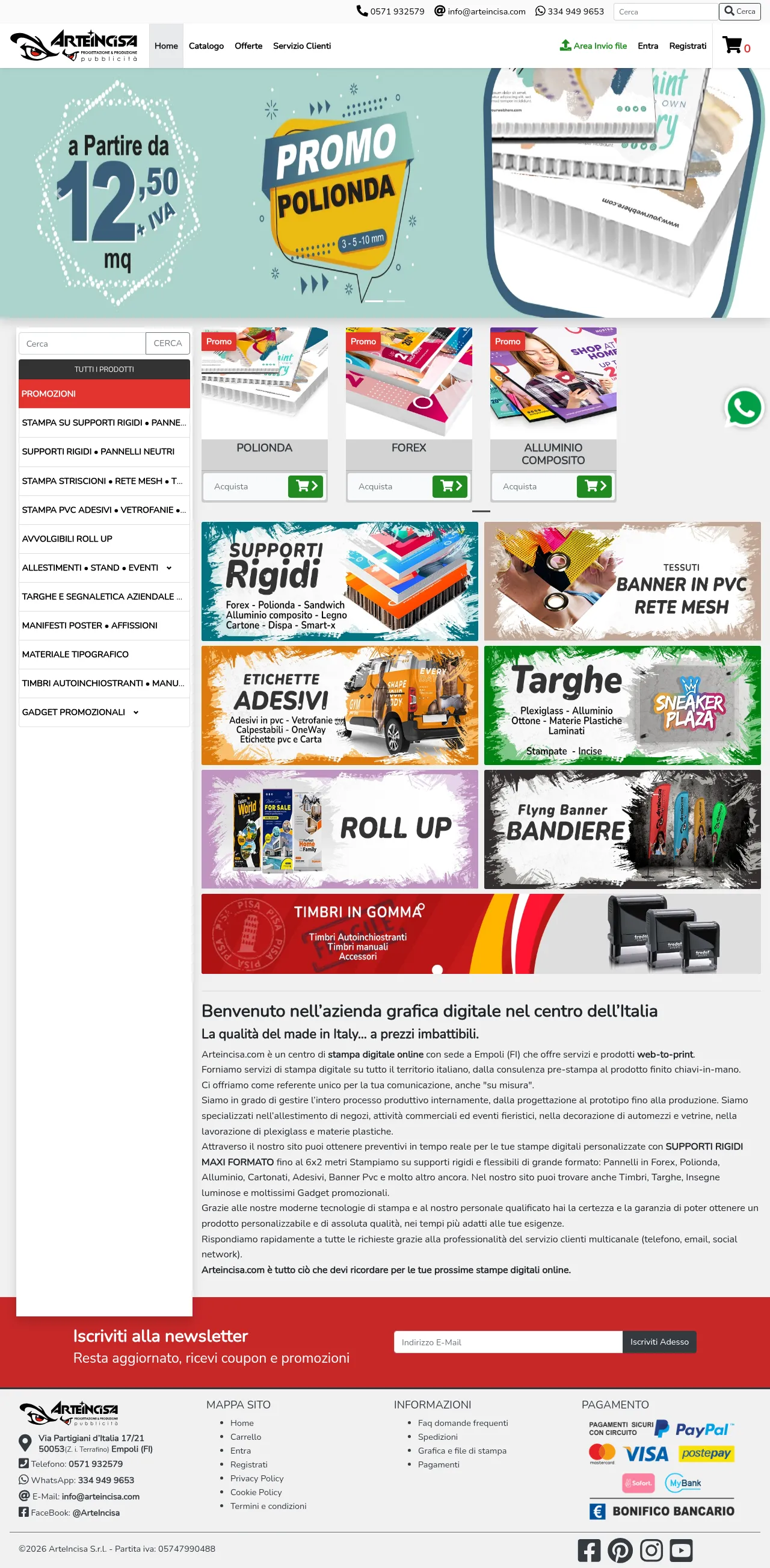 Arteincisa S.r.l. is an Italian-based provider of digital printing and graphic services for both commercial and private clients. The company specializes in large-format printing, signage, promotional materials, and custom stamping solutions. Their capabilities include the production of banners, stickers, display stands, and various office supplies produced via advanced web-to-print technology. They prioritize the quality of Italian manufacturing, offering versatile customization options for materials, colors, and dimensions. Clients can manage orders, upload graphic files, and receive technical support through their online platform.