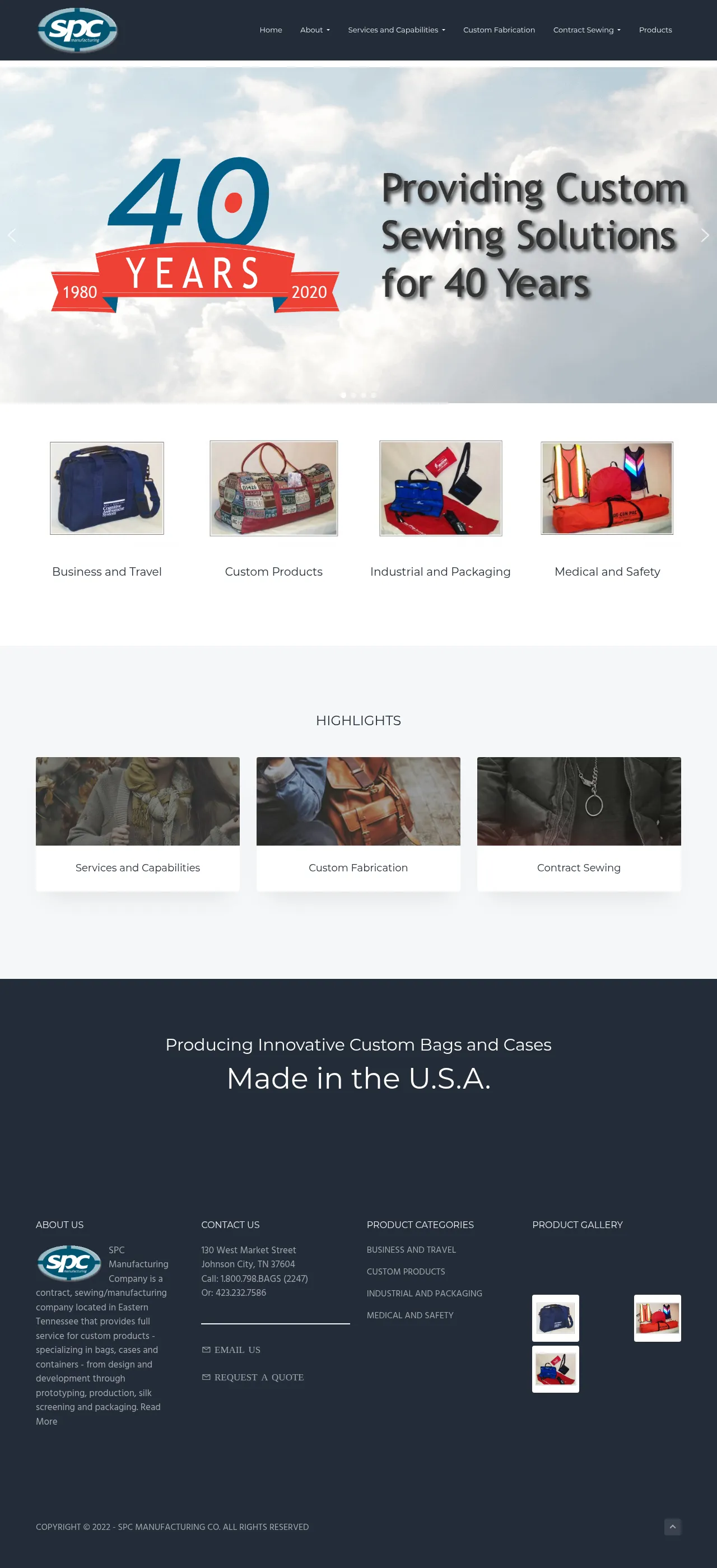 SPC Manufacturing Company is a contract sewing and manufacturing firm based in Eastern Tennessee, providing end-to-end solutions for custom bags, cases, and protective containers. The company manages the entire project lifecycle, including initial design, prototyping, production, multi-color silk screening, and final packaging. Serving industries ranging from medical and safety to industrial packaging and business travel, they offer tailored fabrication with a focus on durability and reinforcement. Their manufacturing process emphasizes high-quality American craftsmanship, ensuring all products are made domestically. The company provides personalized support, assisting clients from initial design concepts through to full-scale volume production.