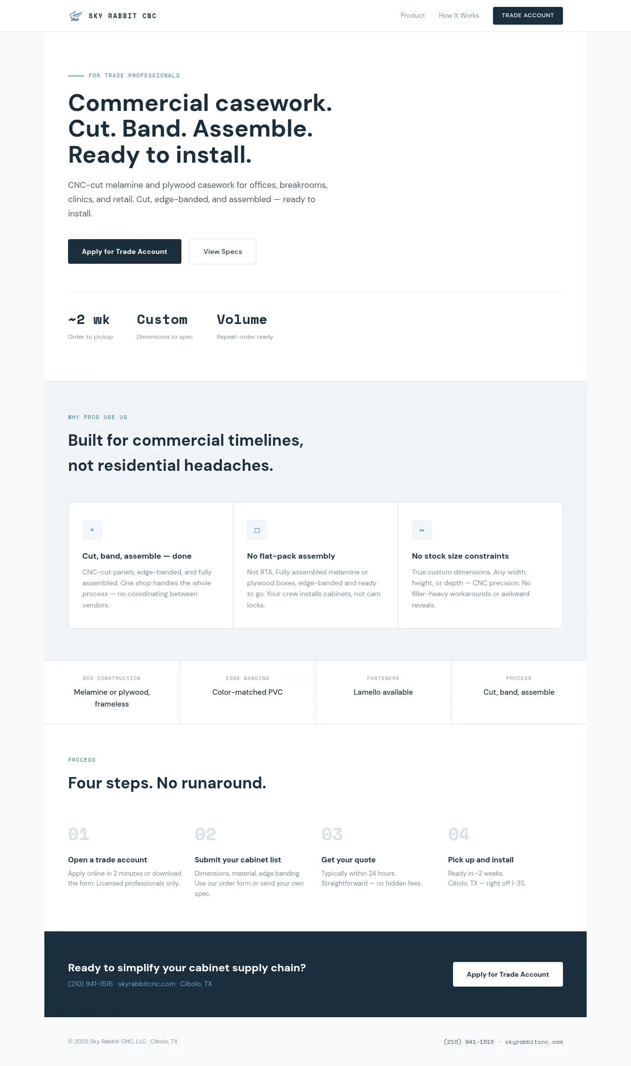 Sky Rabbit CNC is a professional manufacturing service based in Cibolo, Texas, specializing in the production of fully assembled, custom-dimension cabinets. The company serves licensed professionals, including contractors, builders, architects, and designers, by streamlining the cabinet supply chain through rapid, high-precision CNC manufacturing. Their service model focuses on delivering ready-to-install, frameless cabinet boxes in both melamine and plywood, eliminating the need for flat-pack assembly. By offering custom width, height, and depth specifications, they provide tailored solutions that integrate directly into commercial project workflows. The company maintains a business-to-business trade account system to ensure quality and reliability for licensed project stakeholders.