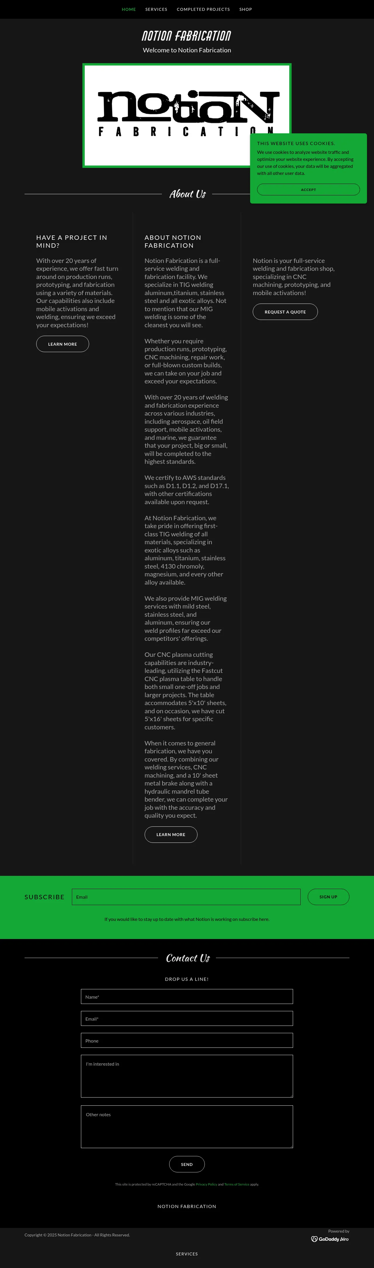 Notion Fabrication is a full-service welding and metal fabrication facility providing high-precision solutions for aerospace, marine, oil field, and commercial applications. Founded in 2021, the company specializes in expert TIG and MIG welding, CNC plasma cutting, and custom sheet metal fabrication. With over two decades of industry experience, the team handles everything from rapid prototyping and small-batch production to complex custom builds. They are committed to strict industry standards, utilizing advanced equipment to ensure superior weld profiles and dimensional accuracy. Their capabilities extend to mobile onsite activations, serving a diverse clientele with a focus on quality, safety, and operational efficiency.