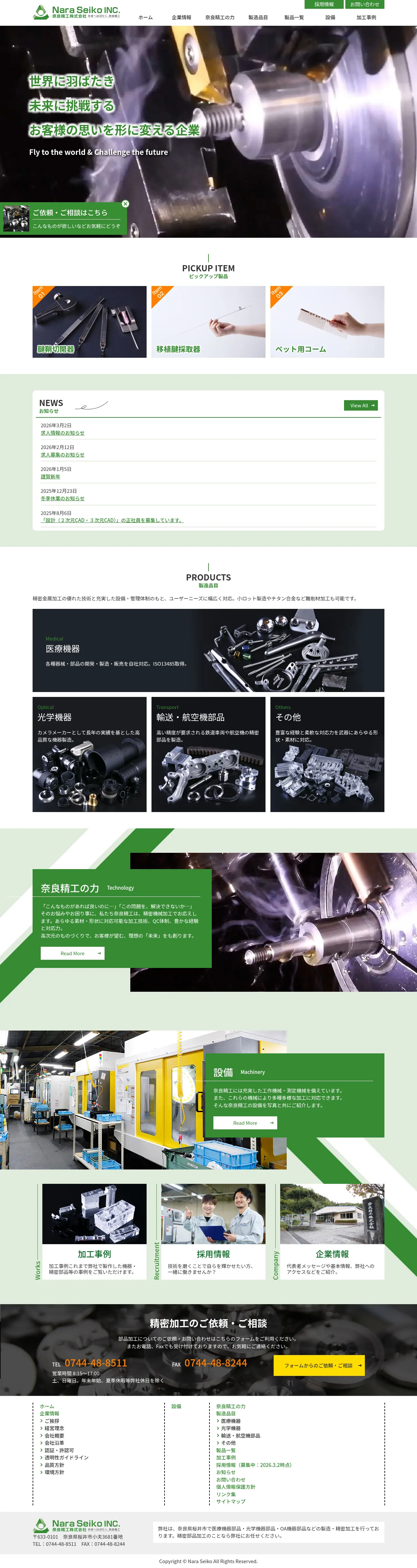 Nara Seiko is a precision parts manufacturer located in Sakurai, Nara Prefecture, Japan. The company develops, manufactures and sells components for medical devices, optical equipment, office automation products and transportation/aerospace applications. It operates machine tools and measuring equipment to perform a wide range of precision machining tasks and holds ISO13485 certification. Nara Seiko supports small-lot production and machining of difficult-to-cut materials, including titanium alloys.